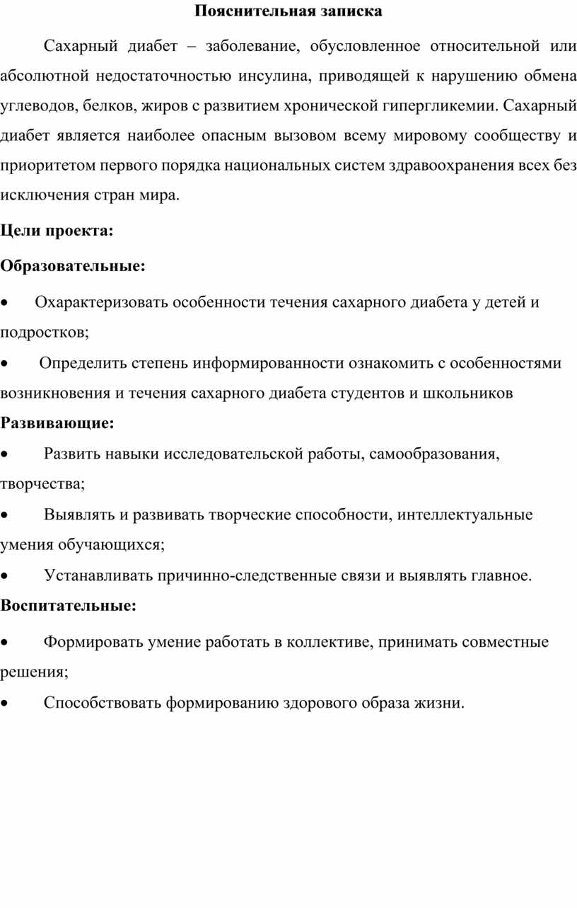 Актуальность: Распространенность диабета увеличивается в эпидемических масштабах во всем мире. В настоящее время в России насчитывается более 18 тыс. детей и более 9,5 тыс. подростков, страдающих сахарным диабетом 1 типа (СД1). Нарастающее увеличение заболеваемости диабетом, как ожидается, будет сопровождаться увеличением распространенности специфических осложнений - ретинопатии, нефропатии, нейропатии и заболеваний сердечно-сосудистой системы. Поэтому необходимо повысить уровень информированности школьников о сахарном диабете.