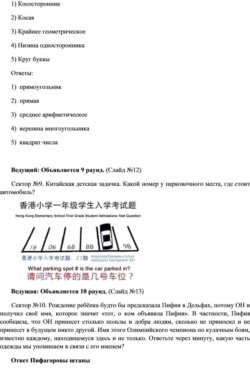 Сектор №9. Китайская детская задачка. Какой номер у парковочного места, где стоит автомобиль?