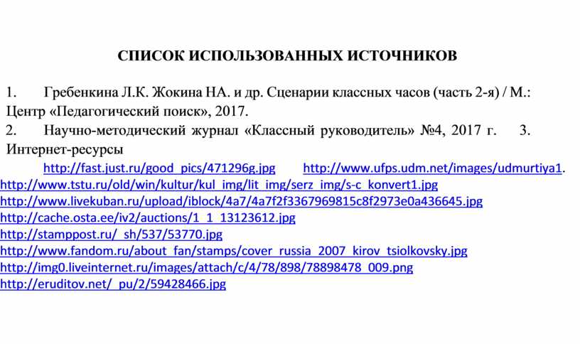 2. Научно-методический журнал «Классный руководитель» №4, 2017 г. 3. Интернет-ресурсы