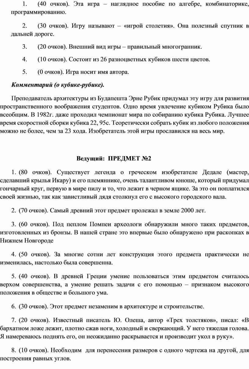 Ведущая: Участникам игры предлагаются наводящие вопросы-подсказки относительно загаданного предмета.. Цена подсказок за каждый вопрос постепенно падает на 10 очков.