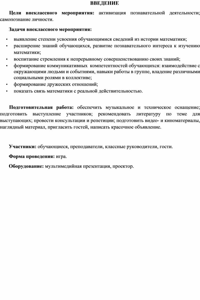 Данная методическая разработка содержит богатый материал для углубления знаний обучающихся в области математики, развития их логического мышления, исследовательских навыков, смекалки, привития вкуса к чтению математической литературы. Главное назначение внеклассного мероприятия – не только расширение и углубление теоретического материала, изученного на уроках, но и развитие умений применять полученные знания к решению нестандартных задач, воспитанию культуры работы над задачей.