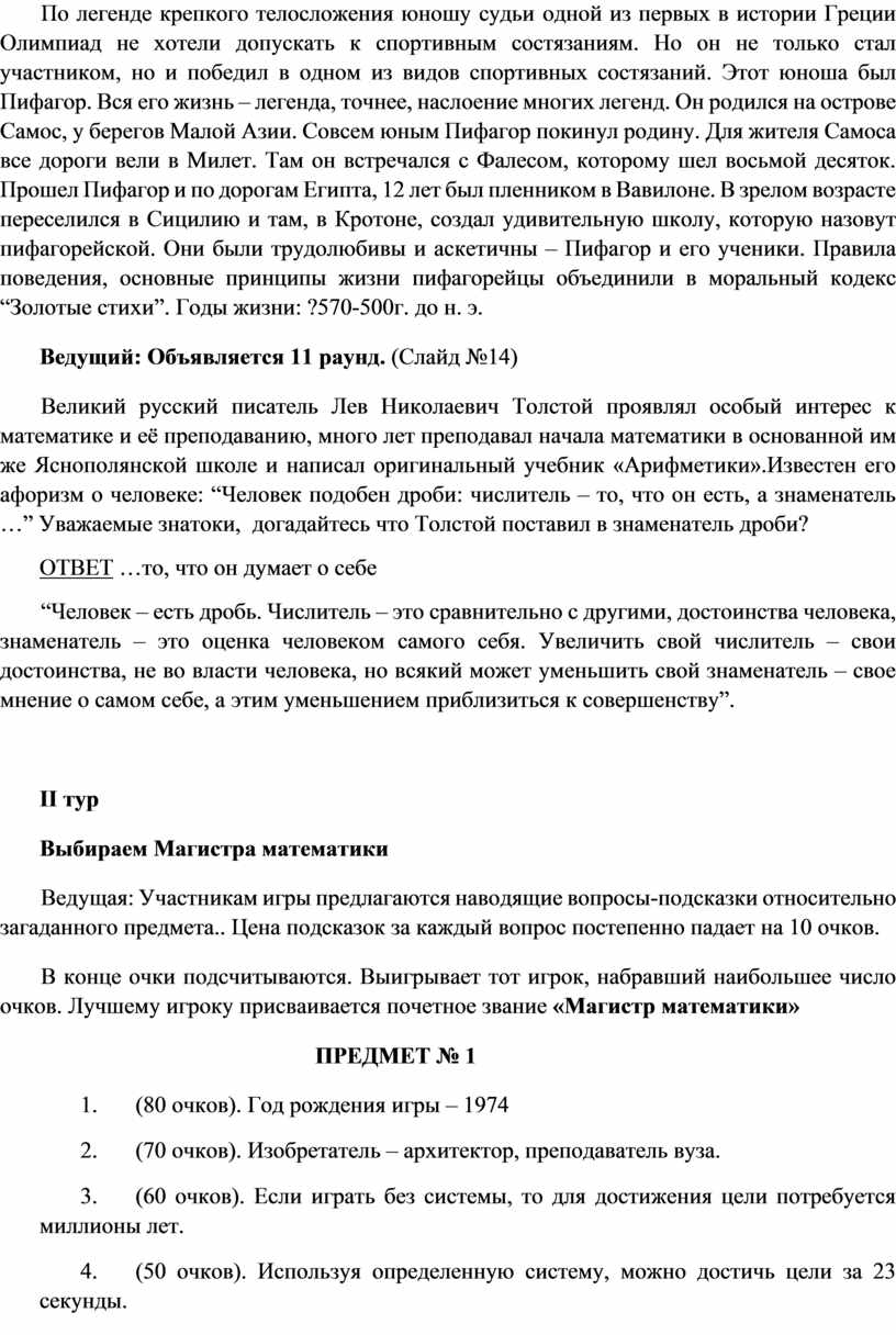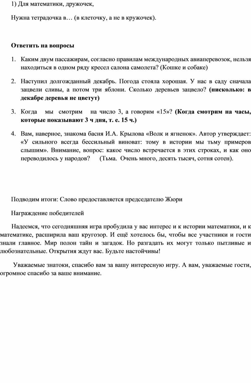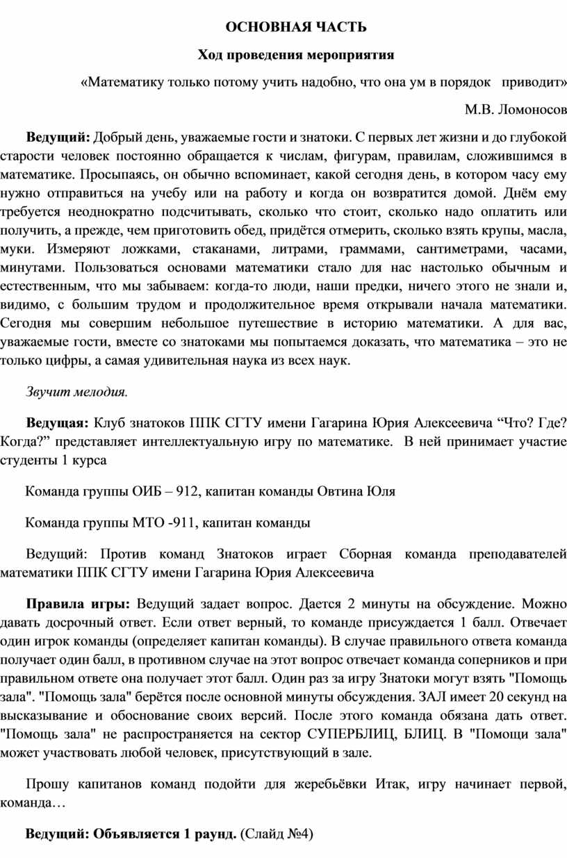Ведущий: Добрый день, уважаемые гости и знатоки. С первых лет жизни и до глубокой старости человек постоянно обращается к числам, фигурам, правилам, сложившимся в математике. Просыпаясь, он обычно вспоминает, какой сегодня день, в котором часу ему нужно отправиться на учебу или на работу и когда он возвратится домой. Днём ему требуется неоднократно подсчитывать, сколько что стоит, сколько надо оплатить или получить, а прежде, чем приготовить обед, придётся отмерить, сколько взять крупы, масла, муки. Измеряют ложками, стаканами, литрами, граммами, сантиметрами, часами, минутами. Пользоваться основами математики стало для нас настолько обычным и естественным, что мы забываем: когда-то люди, наши предки, ничего этого не знали и, видимо, с большим трудом и продолжительное время открывали начала математики. Сегодня мы совершим небольшое путешествие в историю математики. А для вас, уважаемые гости, вместе со знатоками мы попытаемся доказать, что математика – это не только цифры, а самая удивительная наука из всех наук.