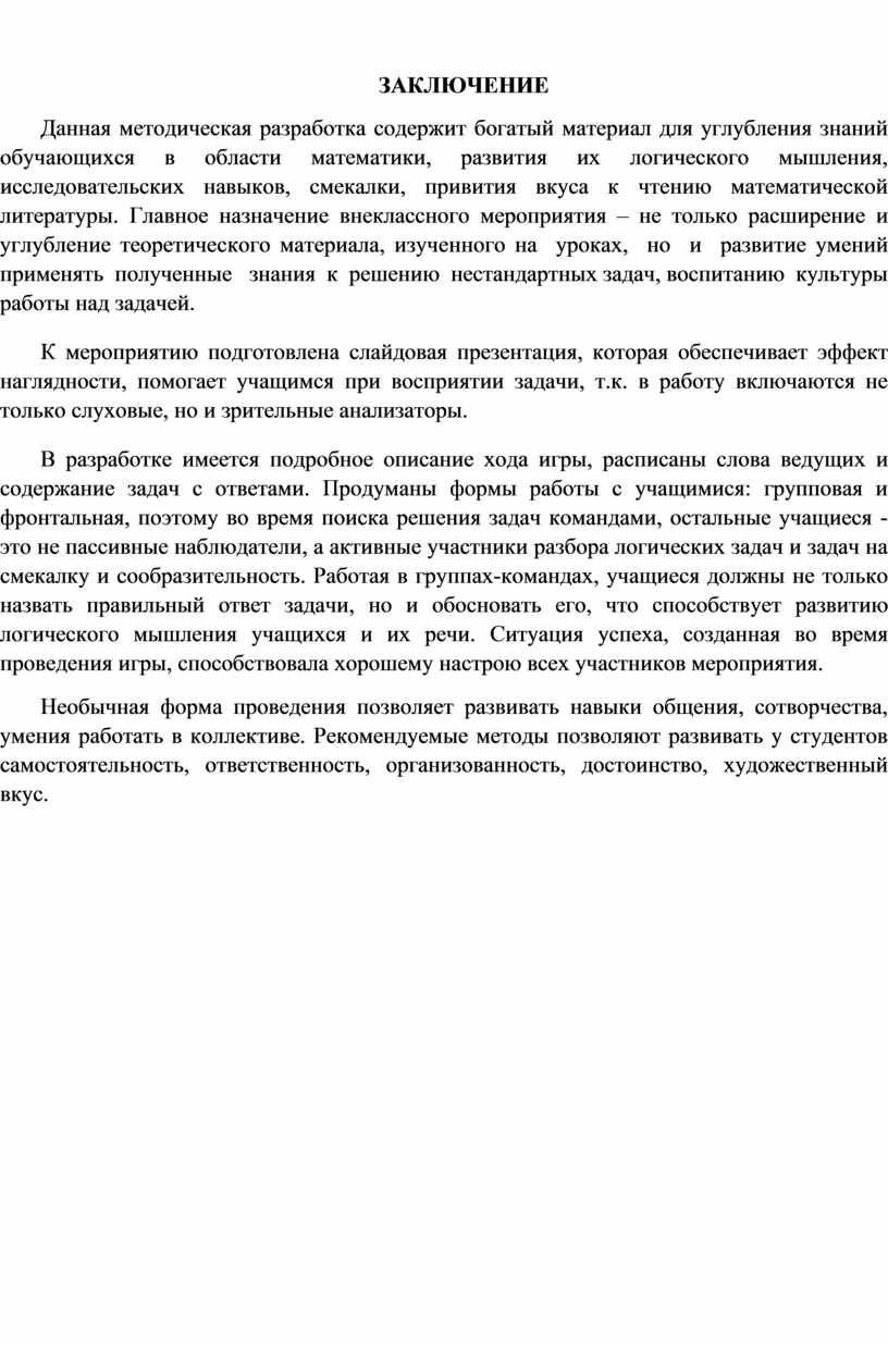 В разработке имеется подробное описание хода игры, расписаны слова ведущих и содержание задач с ответами. Продуманы формы работы с учащимися: групповая и фронтальная, поэтому во время поиска решения задач командами, остальные учащиеся - это не пассивные наблюдатели, а активные участники разбора логических задач и задач на смекалку и сообразительность. Работая в группах-командах, учащиеся должны не только назвать правильный ответ задачи, но и обосновать его, что способствует развитию логического мышления учащихся и их речи. Ситуация успеха, созданная во время проведения игры, способствовала хорошему настрою всех участников мероприятия.