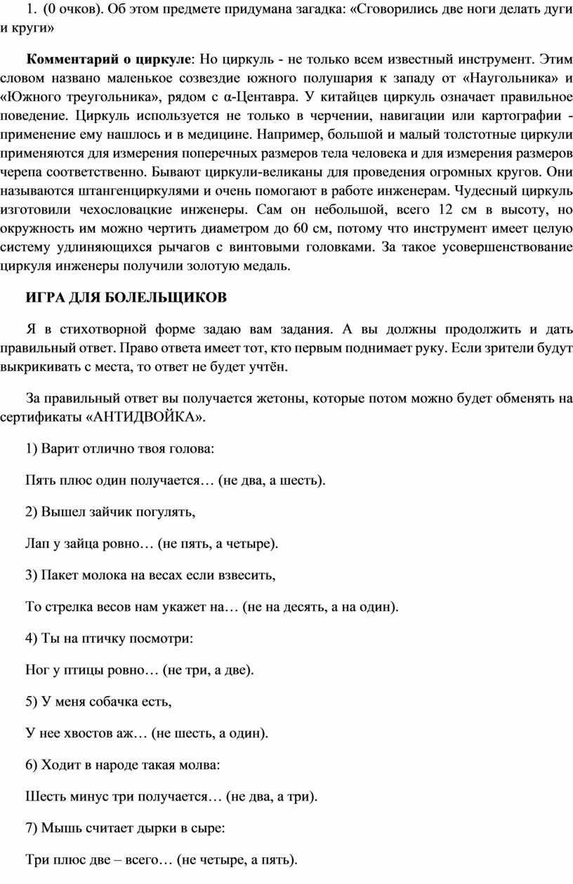 9. (0 очков). Об этом предмете придумана загадка: «Сговорились две ноги делать дуги и круги»