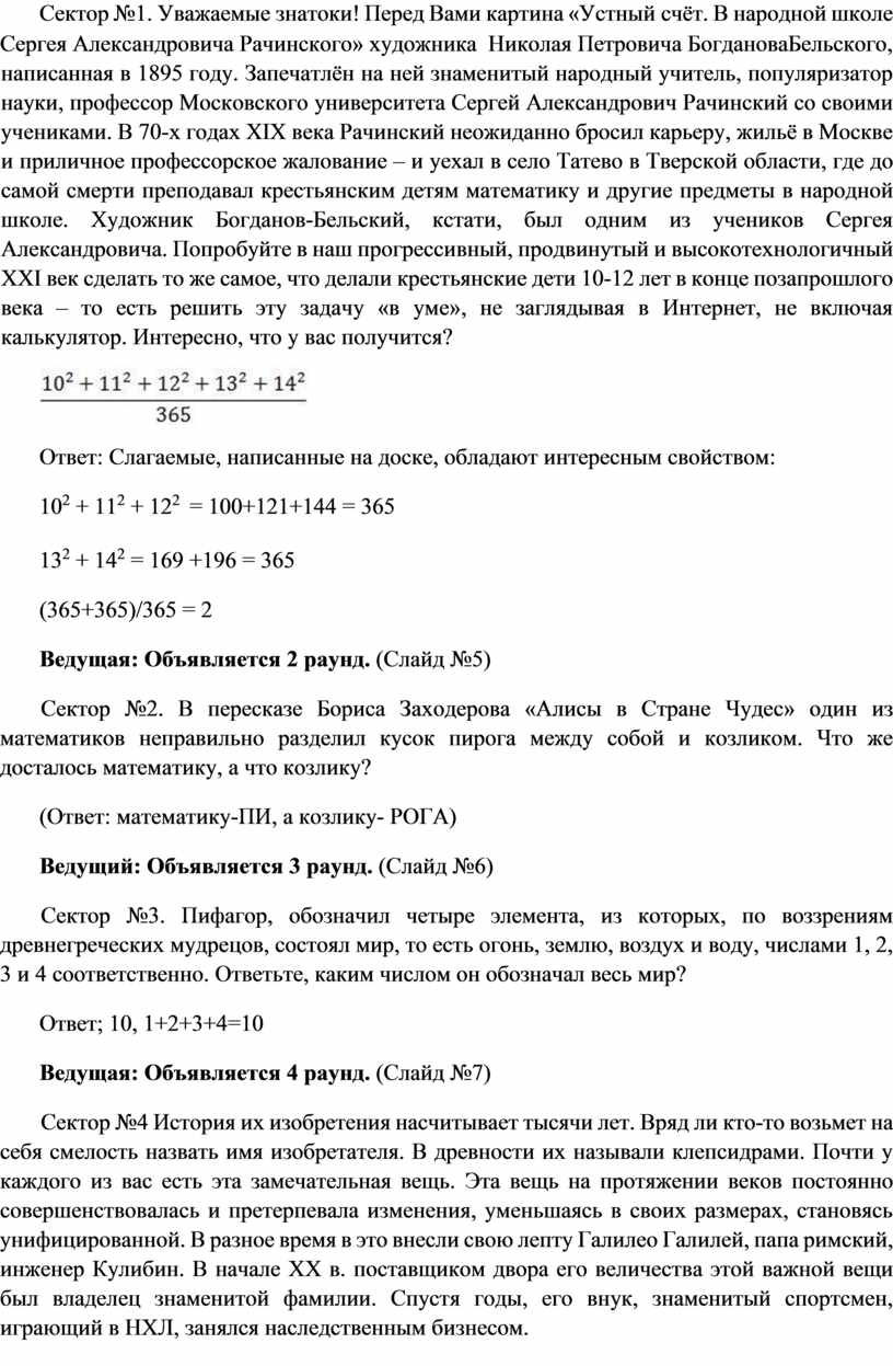 Сергея Александровича Рачинского» художника Николая Петровича БогдановаБельского, написанная в 1895 году. Запечатлён на ней знаменитый народный учитель, популяризатор науки, профессор Московского университета Сергей Александрович Рачинский со своими учениками. В 70-х годах XIX века Рачинский неожиданно бросил карьеру, жильё в Москве и приличное профессорское жалование – и уехал в село Татево в Тверской области, где до самой смерти преподавал крестьянским детям математику и другие предметы в народной школе. Художник Богданов-Бельский, кстати, был одним из учеников Сергея Александровича. Попробуйте в наш прогрессивный, продвинутый и высокотехнологичный XXI век сделать то же самое, что делали крестьянские дети 10-12 лет в конце позапрошлого века – то есть решить эту задачу «в уме», не заглядывая в Интернет, не включая калькулятор. Интересно, что у вас получится?