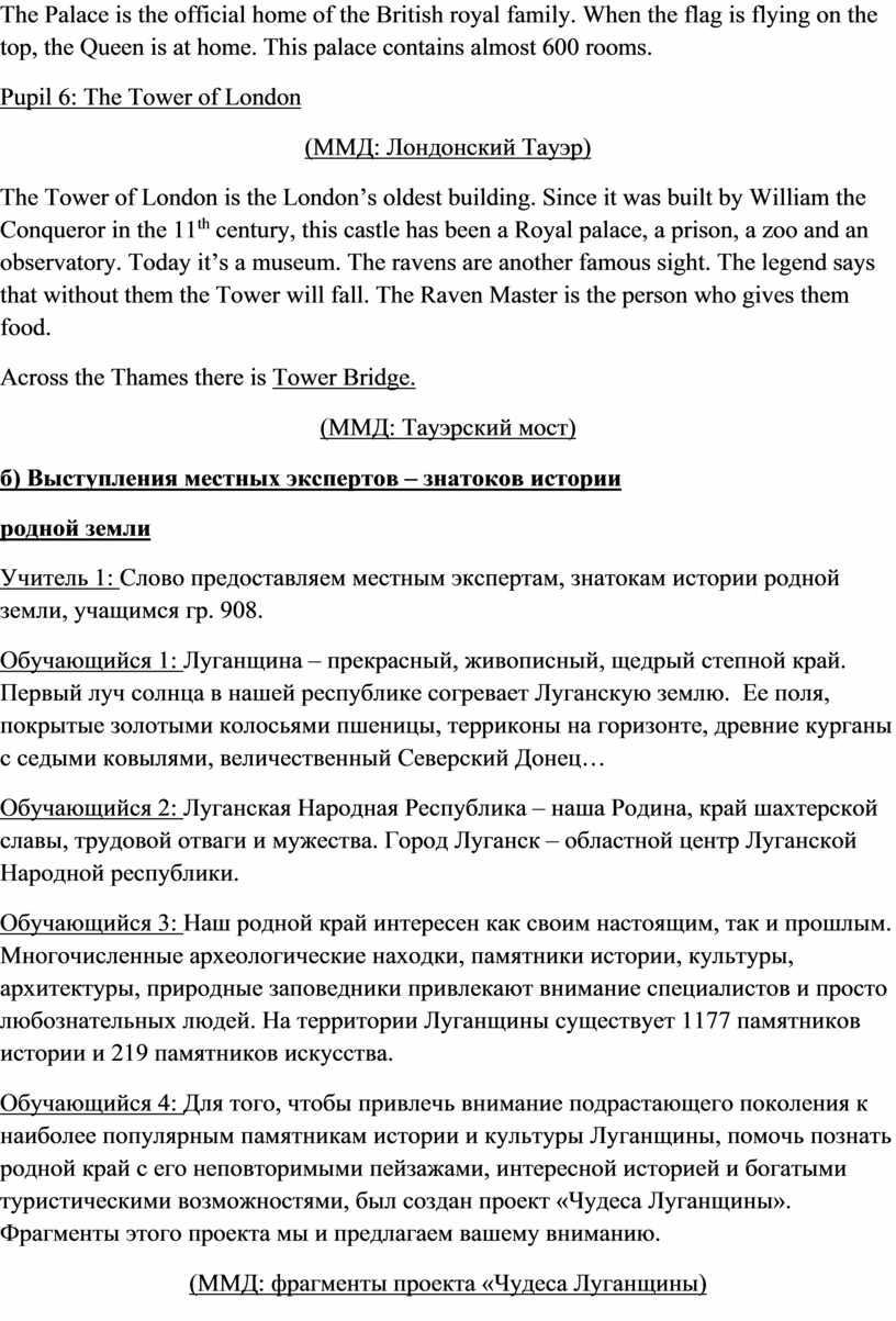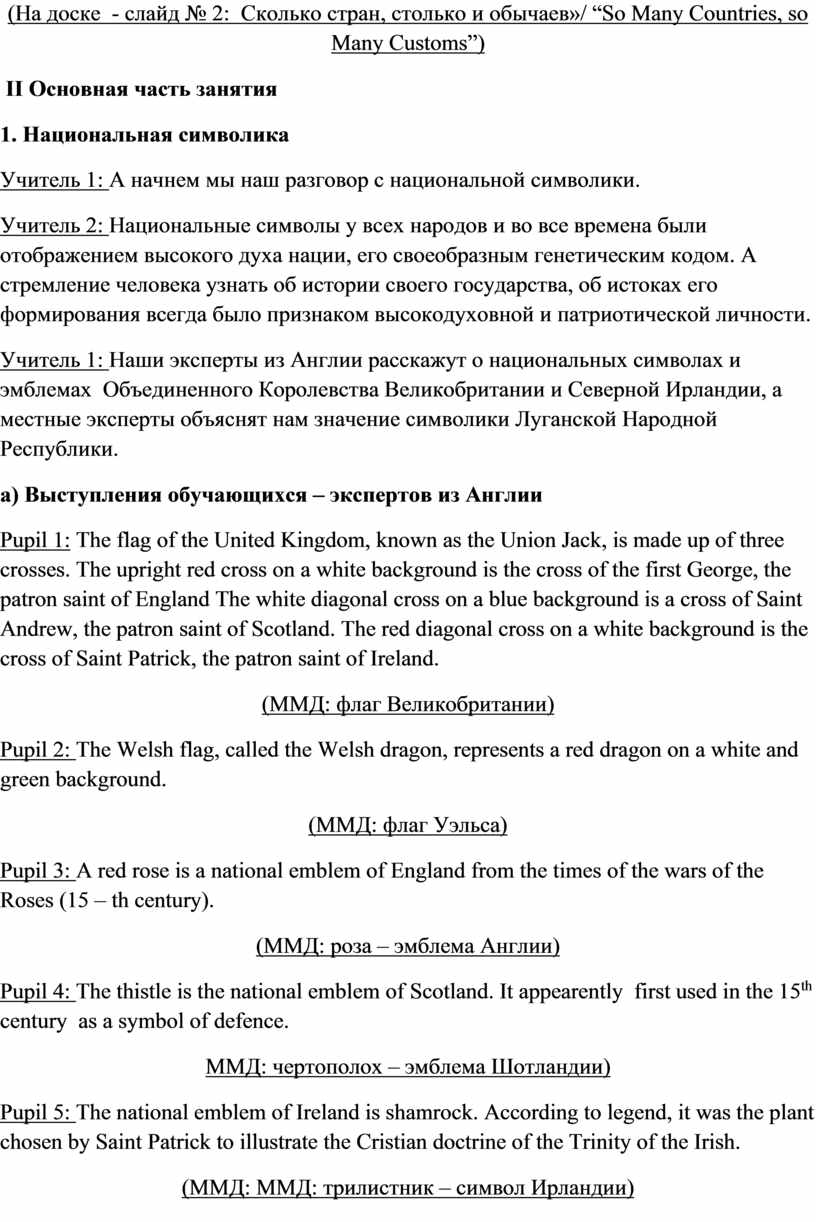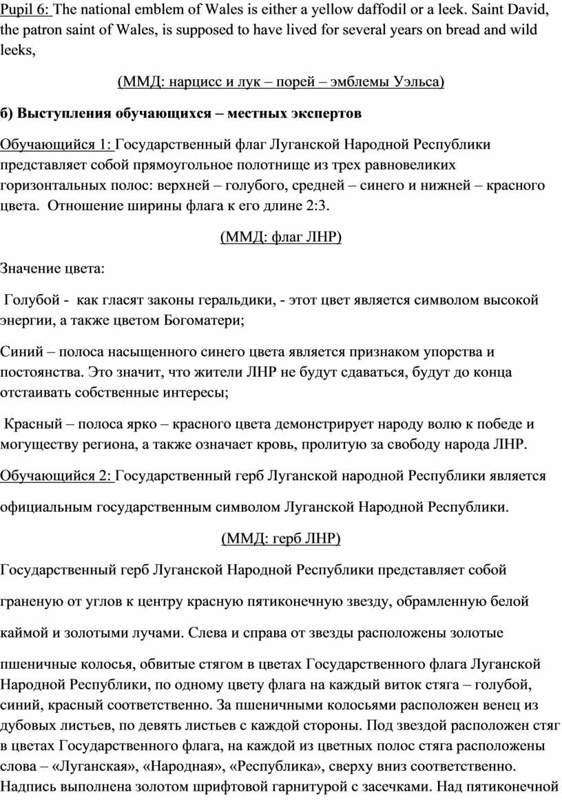 Учитель 1: Наши эксперты из Англии расскажут о национальных символах и эмблемах Объединенного Королевства Великобритании и Северной Ирландии, а местные эксперты объяснят нам значение символики Луганской Народной Республики.