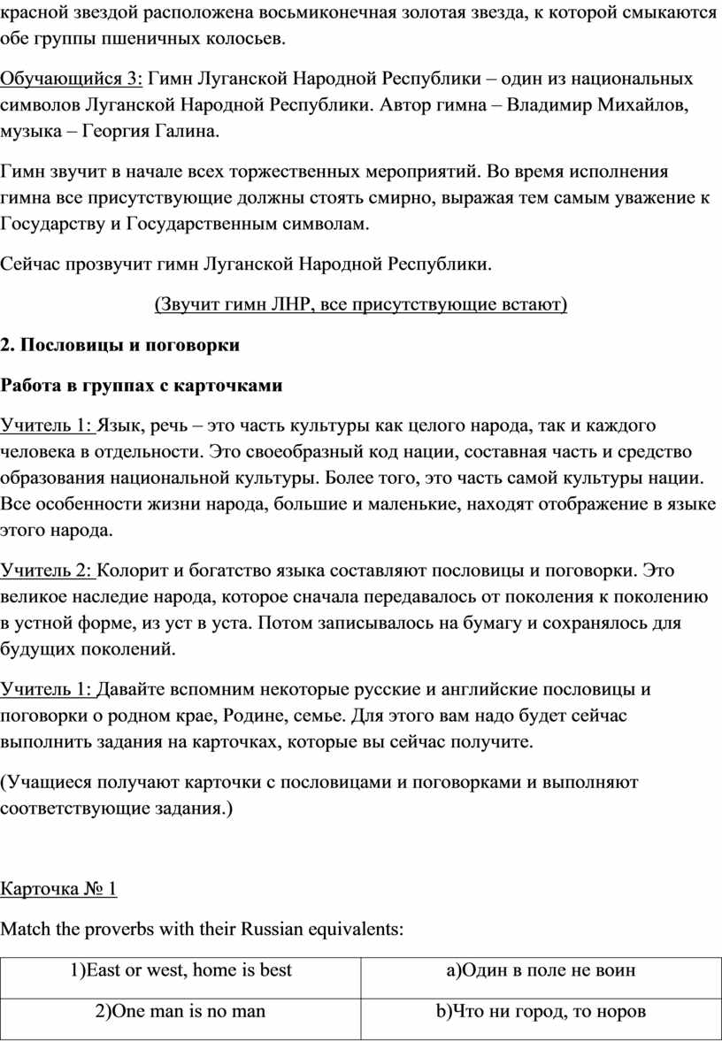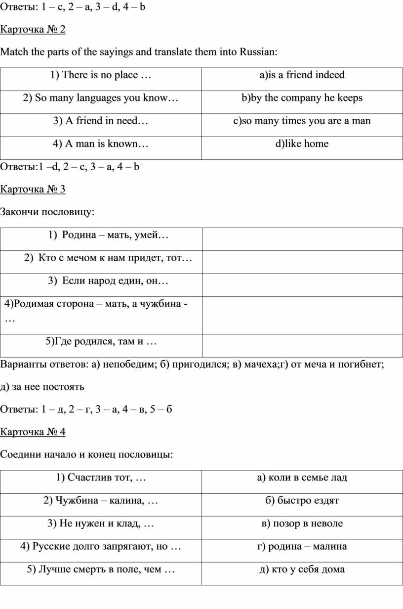 Учитель 1: Давайте вспомним некоторые русские и английские пословицы и поговорки о родном крае, Родине, семье. Для этого вам надо будет сейчас выполнить задания на карточках, которые вы сейчас получите.