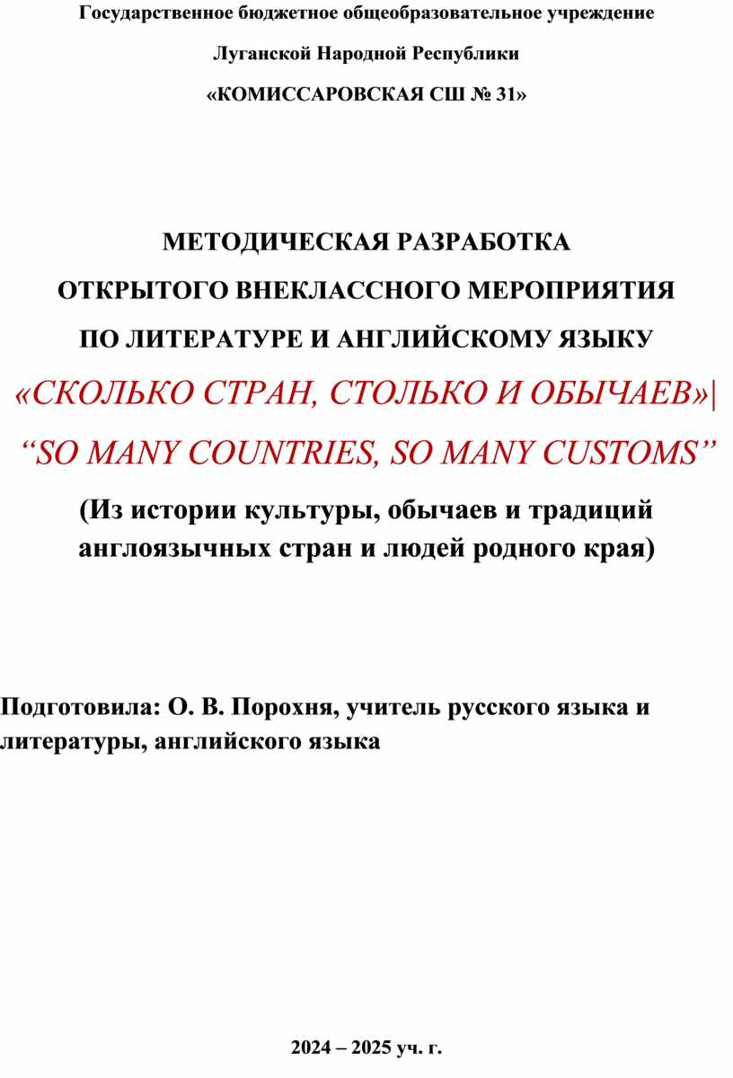 Учитель 2: Обычаи и традиции очень важны как для жителей туманного Альбиона, так и для жителей Луганской Народной Республики. Так, англичане славятся тем, что считаются нацией с исторически сложившимися богатыми традициями, несколько консервативными взглядами и привычками. Жители Луганщины тоже гордятся своими обрядами и чтят свои праздники.