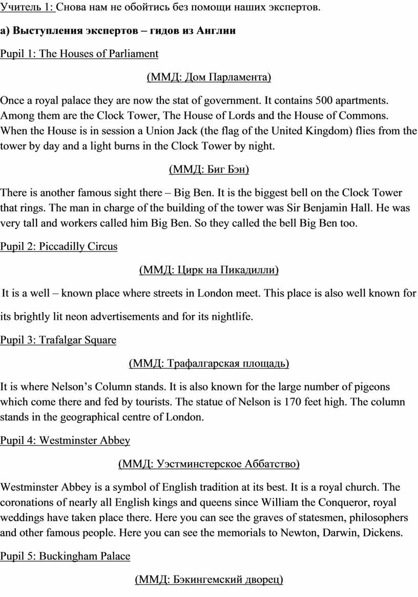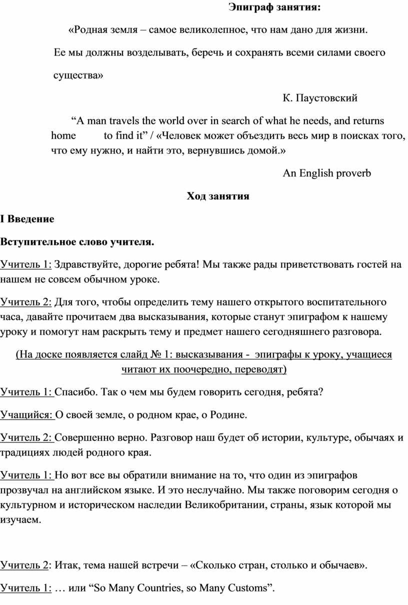 Учитель 1: Но вот все вы обратили внимание на то, что один из эпиграфов прозвучал на английском языке. И это неслучайно. Мы также поговорим сегодня о культурном и историческом наследии Великобритании, страны, язык которой мы изучаем.