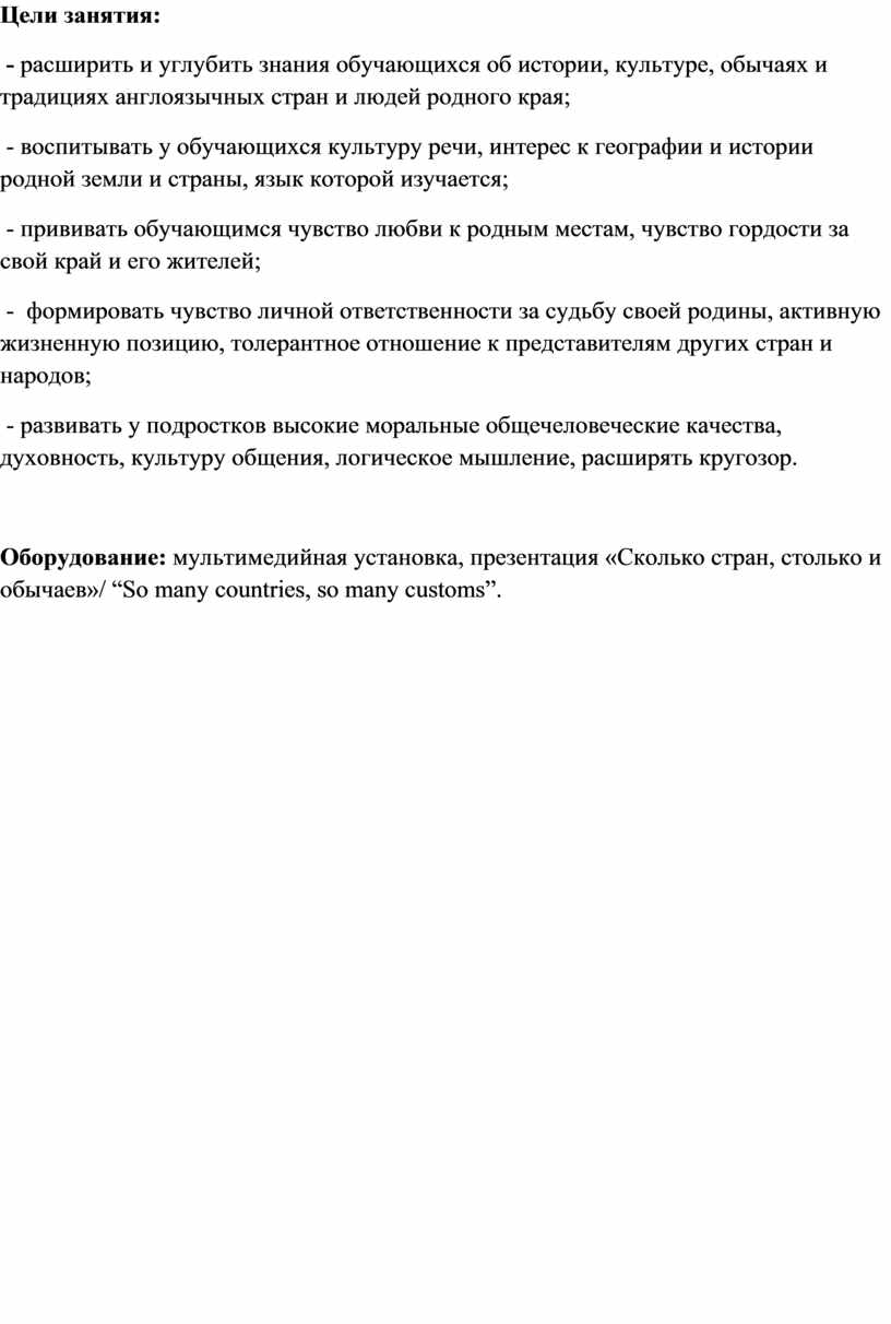 - расширить и углубить знания обучающихся об истории, культуре, обычаях и традициях англоязычных стран и людей родного края;