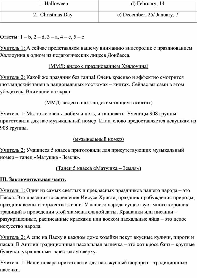 Учитель 1: Итак, мы с вами уже убедились, что каждая страна имеет свои обычаи и традиции. К таковым относятся в первую очередь праздники. Знание обычаев и традиций дает нам возможность лучше узнать об истории, культуре страны, о ее людях, их мыслях, характере, привычках, душе.