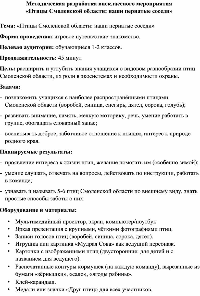 Цель: расширить и углубить знания учащихся о видовом разнообразии птиц Смоленской области, их роли в экосистемах и необходимости охраны.