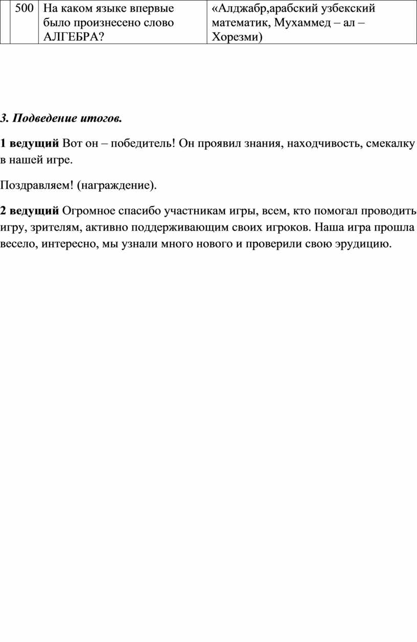 внеклассной работы, направленной на стимулирование познавательного интереса к дисциплине «Математика» и развитие навыков поведения в затруднительной ситуации, коммуникативного общения. Повышается эрудиция как игроков, так и зрителей.