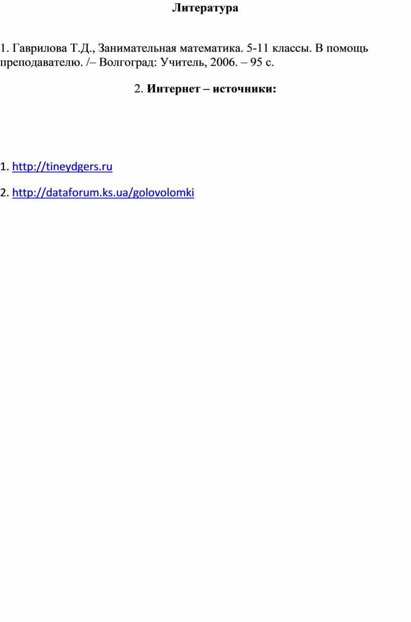1. Гаврилова Т.Д., Занимательная математика. 5-11 классы. В помощь преподавателю. /– Волгоград: Учитель, 2006. – 95 с.