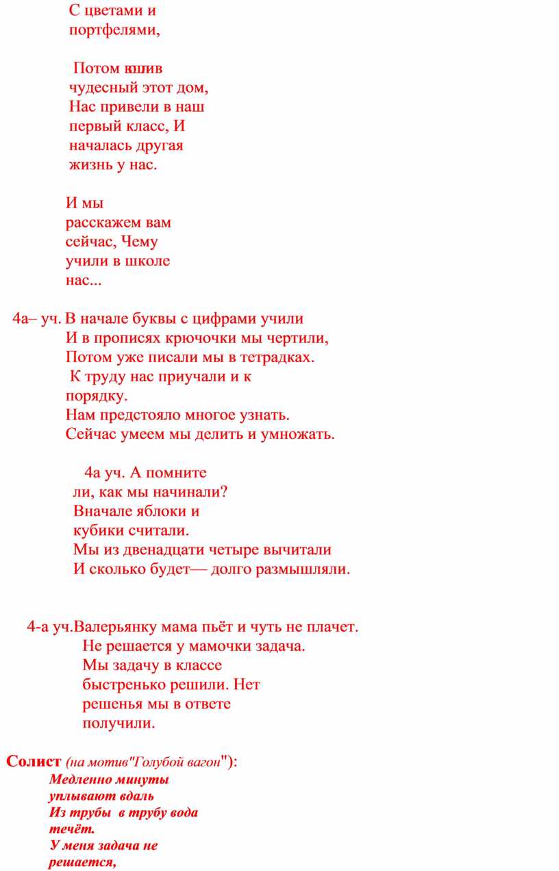 ВЕД.: Дорогие родители и уважаемые гости! Мы рады видеть вас на нашем празднике! Сегодня мы все немного волнуемся. Сегодня у нас необычный день– день прощания с начальной школой.