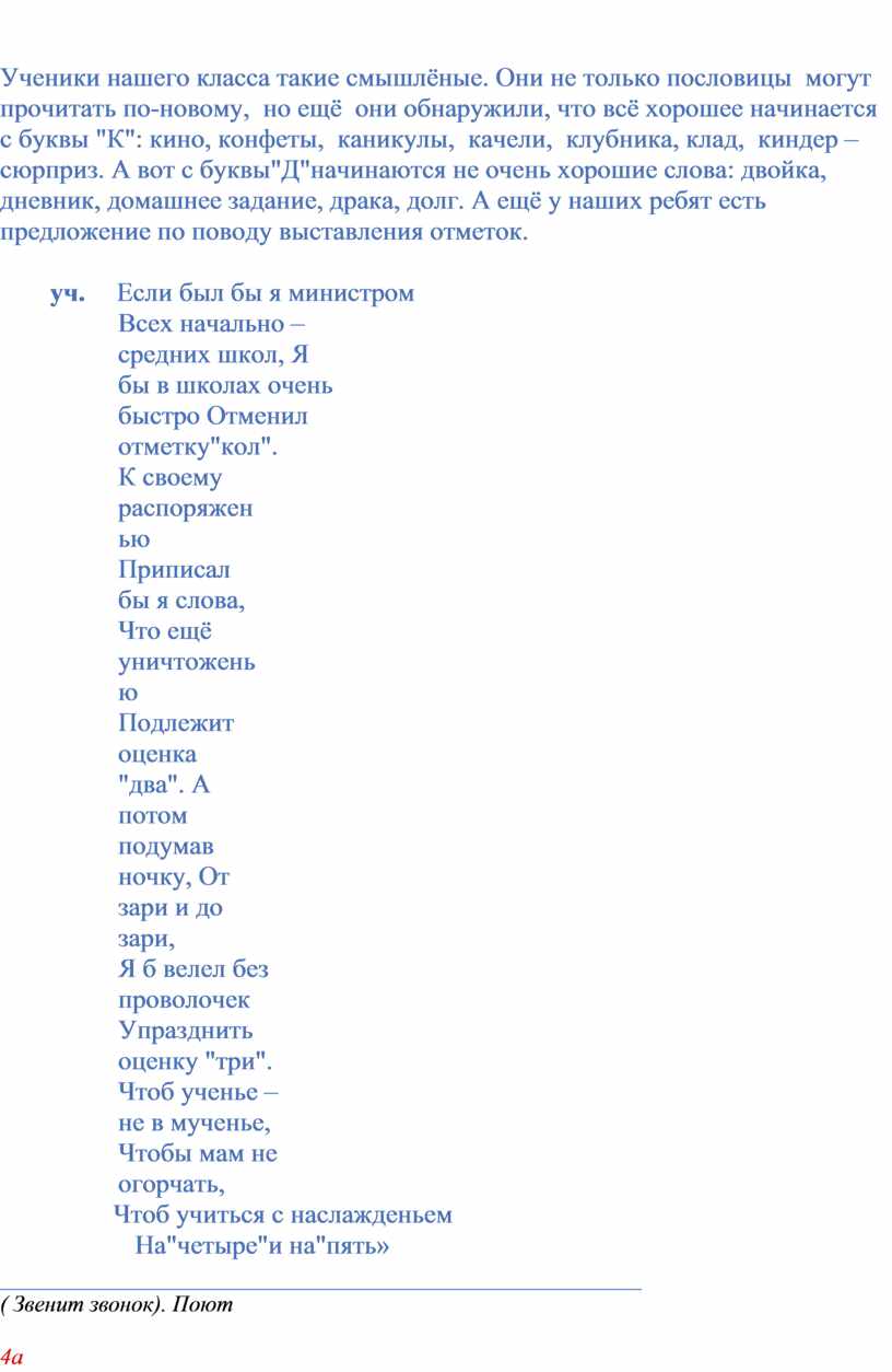 Ученики нашего класса такие смышлёные. Они не только пословицы могут прочитать по-новому, но ещё они обнаружили, что всё хорошее начинается с буквы "К": кино, конфеты, каникулы, качели, клубника, клад, киндер – сюрприз. А вот с буквы"Д"начинаются не очень хорошие слова: двойка, дневник, домашнее задание, драка, долг. А ещё у наших ребят есть предложение по поводу выставления отметок.