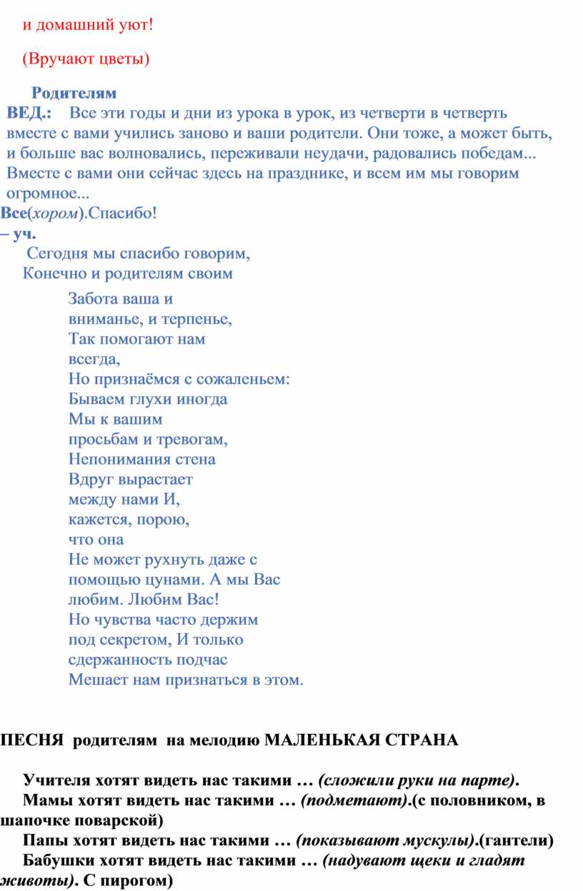 ВЕД.: Все эти годы и дни из урока в урок, из четверти в четверть вместе с вами учились заново и ваши родители. Они тоже, а может быть, и больше вас волновались, переживали неудачи, радовались победам... Вместе с вами они сейчас здесь на празднике, и всем им мы говорим огромное...