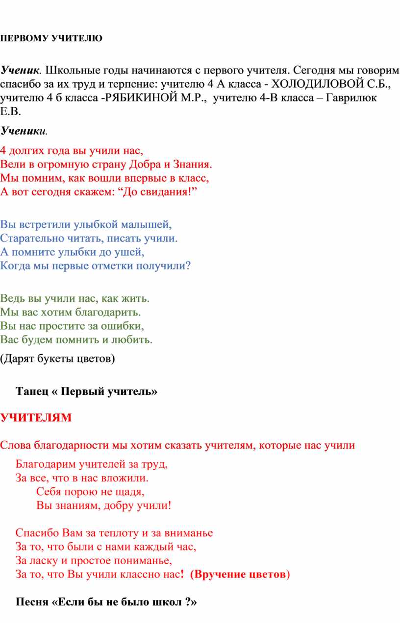 Ученик. Школьные годы начинаются с первого учителя. Сегодня мы говорим спасибо за их труд и терпение: учителю 4 А класса - ХОЛОДИЛОВОЙ С.Б., учителю 4 б класса -РЯБИКИНОЙ М.Р., учителю 4-В класса – Гаврилюк Е.В.