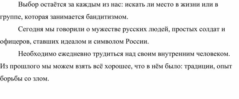 Мы с вами сейчас живём, делаем что-то для своей школы, района, села. И все наши дела через некоторое время станут историей, ведь история – это наше прошлое. Задумаемся, плохие или хорошие наши дела запомнят люди. Выбор остаётся за каждым из нас: искать ли место в жизни или в группе, которая занимается бандитизмом.