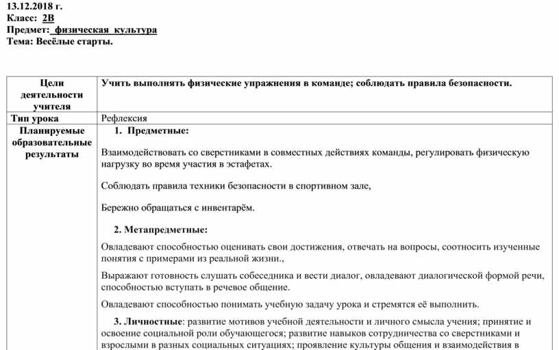 1. Предметные: Взаимодействовать со сверстниками в совместных действиях команды, регулировать физическую нагрузку во время участия в эстафетах. Соблюдать правила техники безопасности в спортивном зале, Бережно обращаться с инвентарём. 2. Метапредметные: Овладевают способностью оценивать свои достижения, отвечать на вопросы, соотносить изученные понятия с примерами из реальной жизни., Выражают готовность слушать собеседника и вести диалог, овладевают диалогической формой речи, способностью вступать в речевое общение. Овладевают способностью понимать учебную задачу урока и стремятся её выполнить. 3. Личностные: развитие мотивов учебной деятельности и личного смысла учения; принятие и освоение социальной роли обучающегося; развитие навыков сотрудничества со сверстниками и взрослыми в разных социальных ситуациях; проявление культуры общения и взаимодействия в процессе занятий физической культурой; развитие самостоятельности и личной ответственности за свои поступки; формирование установки на безопасный и здоровый образ жизни. |