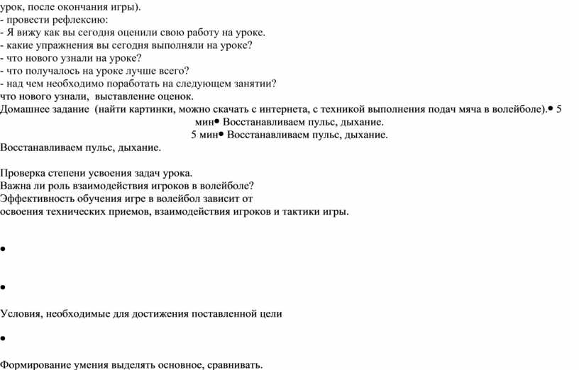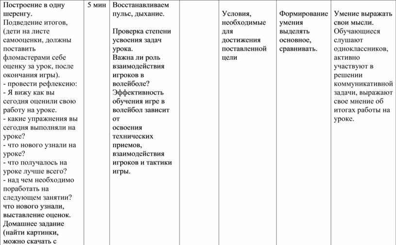 Построение в одну шеренгу. Подведение итогов, (дети на листе самооценки, должны поставить фломастерами себе оценку за урок, после окончания игры). - провести рефлексию: - Я вижу как вы сегодня оценили свою работу на уроке. - какие упражнения вы сегодня выполняли на уроке? - что нового узнали на уроке? - что получалось на уроке лучше всего? - над чем необходимо поработать на следующем занятии? что нового узнали, выставление оценок. Домашнее задание (найти картинки, можно скачать с интернета, с техникой выполнения подач мяча в волейболе). |