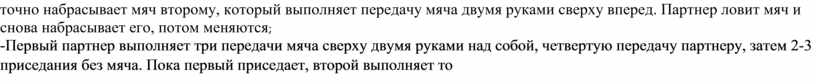 Учитель демонстрирует в паре элементы волейбола, верхняя и нижняя передачи мяча. Ведет беседу с классом о теме урока. -«Как вы думаете, элемент какой игры я показала?» -«Что вы знаете об этой игре?»; -« Умеете ли вы в нее играть?»; - « Хотели ли вы научиться в нее играть?»; -«Как вы думаете, что нужно сделать на уроке, чтобы начать учиться играть в волейбол?» Класс делится в колонну по два и проводятся броски волейбольного мяча в парах: - броски мяча одной рукой вверх, поймать двумя; -Передача мяча двумя руками сверху над собой; - высокие броски двумя руками; - броски мяча с ударом о пол; -Первый игрок точно набрасывает мяч второму, который выполняет передачу мяча двумя руками сверху вперед. Партнер ловит мяч и снова набрасывает его, потом меняются; -Первый партнер выполняет три передачи мяча сверху двумя руками над собой, четвертую передачу партнеру, затем 2-3 приседания без мяча. Пока первый приседает, второй выполняет то же; - передача мяча двумя руками сверху и снизу на оптимальном (удобном) расстоянии.