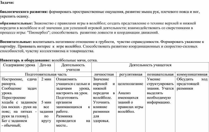 Воспитательные: воспитывать негативное отношение к грубости, чувство справедливости. Формировать уважение к партнёру. Прививать интерес к игре волейбол. Способствовать развитию координационных и скоростно-силовых способностей, чувству коллективизма и товарищества.