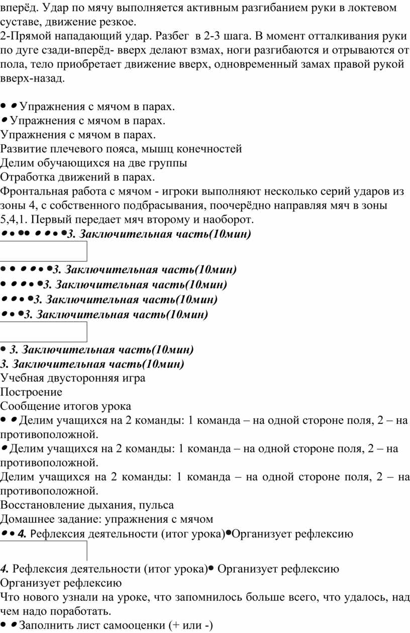 2. Основная часть (20-25мин) 1. Жонглирование мячом: -передача мяча вокруг себя -подбрасывание мяча над собой, чередуя подброс и ловлю мяча -поочерёдное перебрасывание мяча через правое и левое плечо - повороты вокруг себя на 360 с подбрасыванием мяча -приседание, после подбрасывания мяча 1. Индивидуальная работа с мячом: -выполняется передача одной рукой. Выполняется в прыжке. Во время прыжка руку выносят над головой. Локоть высоко поднят и направлен вперёд, кисть развёрнута ладонью вперёд. Удар по мячу выполняется активным разгибанием руки в локтевом суставе, движение резкое. 2-Прямой нападающий удар. Разбег в 2-3 шага. В момент отталкивания руки по дуге сзади-вперёд- вверх делают взмах, ноги разгибаются и отрываются от пола, тело приобретает движение вверх, одновременный замах правой рукой вверх-назад.