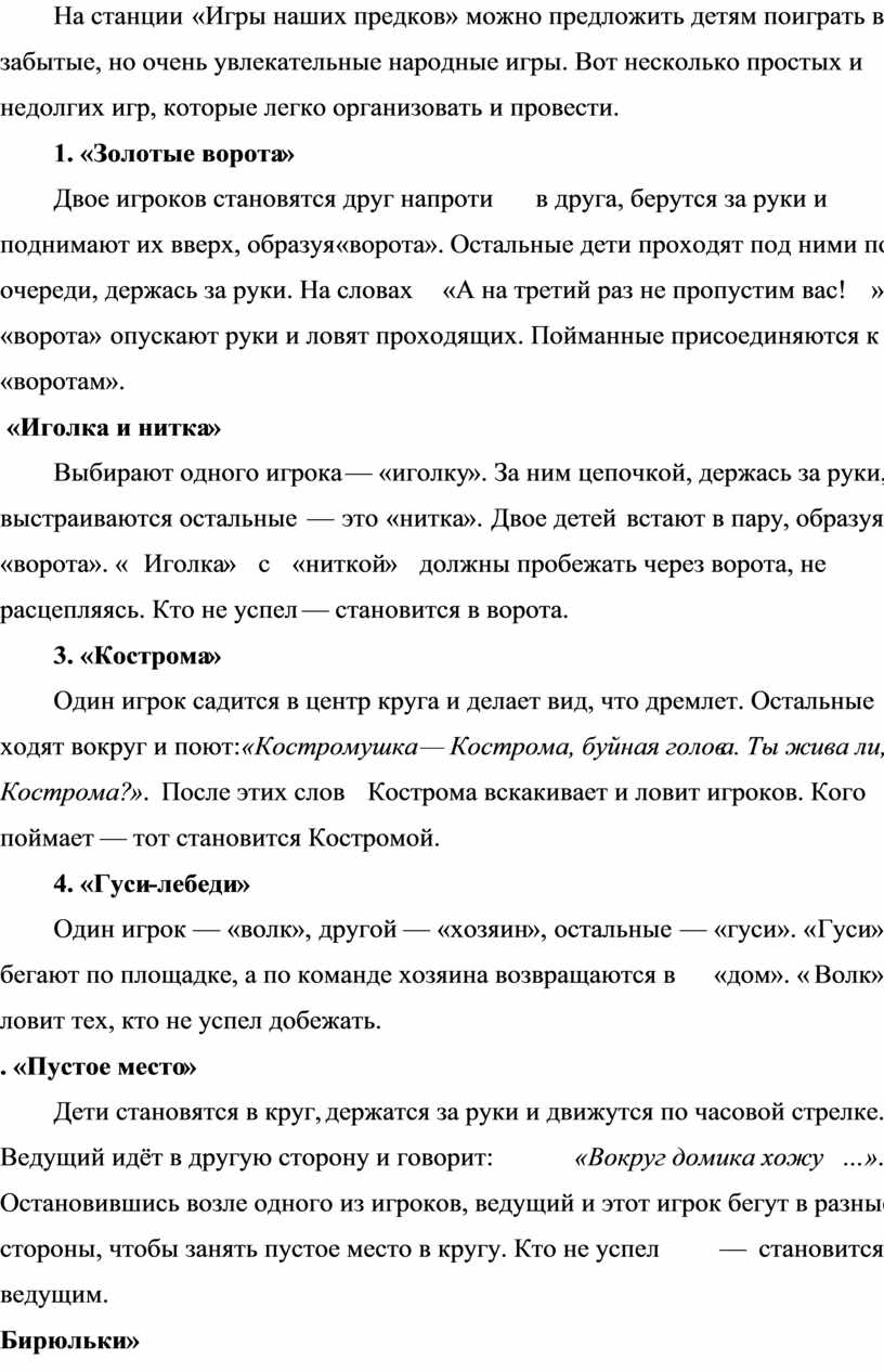 На станции «Игры наших предков» можно предложить детям поиграть в забытые, но очень увлекательные народные игры. Вот несколько простых и недолгих игр, которые легко организовать и провести.