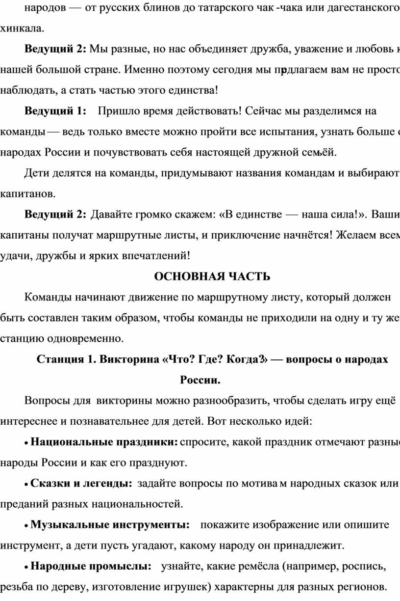 Ведущий 1: Пришло время действовать! Сейчас мы разделимся на команды — ведь только вместе можно пройти все испытания, узнать больше о народах России и почувствовать себя настоящей дружной семьёй.