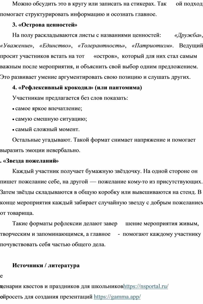 Такие форматы рефлексии делают завершение мероприятия живым, творческим и запоминающимся, а главное - помогают каждому участнику почувствовать себя частью общего дела.