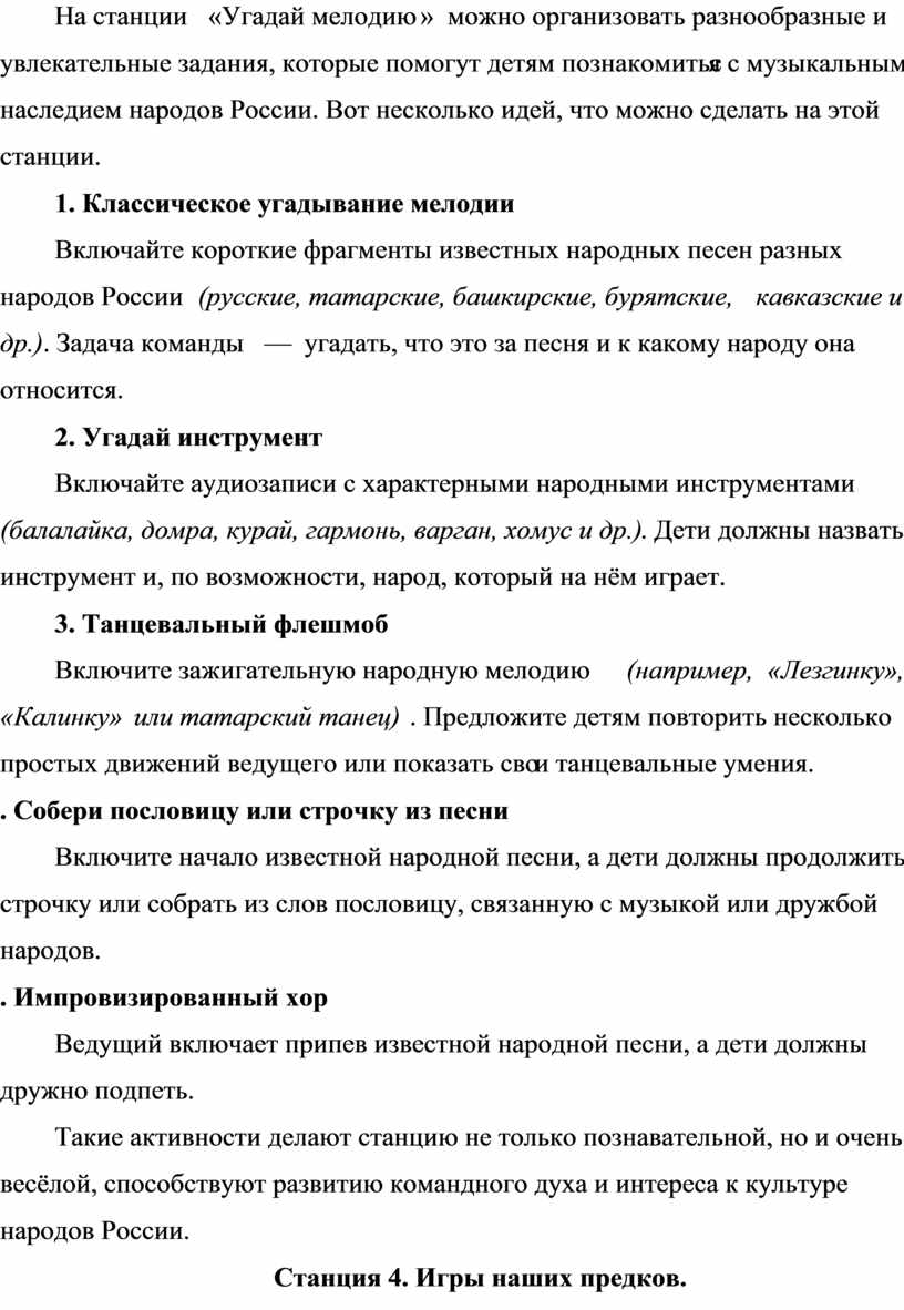 На станции «Угадай мелодию» можно организовать разнообразные и увлекательные задания, которые помогут детям познакомиться с музыкальным наследием народов России. Вот несколько идей, что можно сделать на этой станции.
