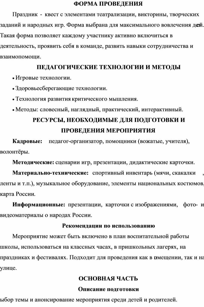 Праздник - квест с элементами театрализации, викторины, творческих заданий и народных игр. Форма выбрана для максимального вовлечения детей. Такая форма позволяет каждому участнику активно включиться в деятельность, проявить себя в команде, развить навыки сотрудничества и взаимопомощи.