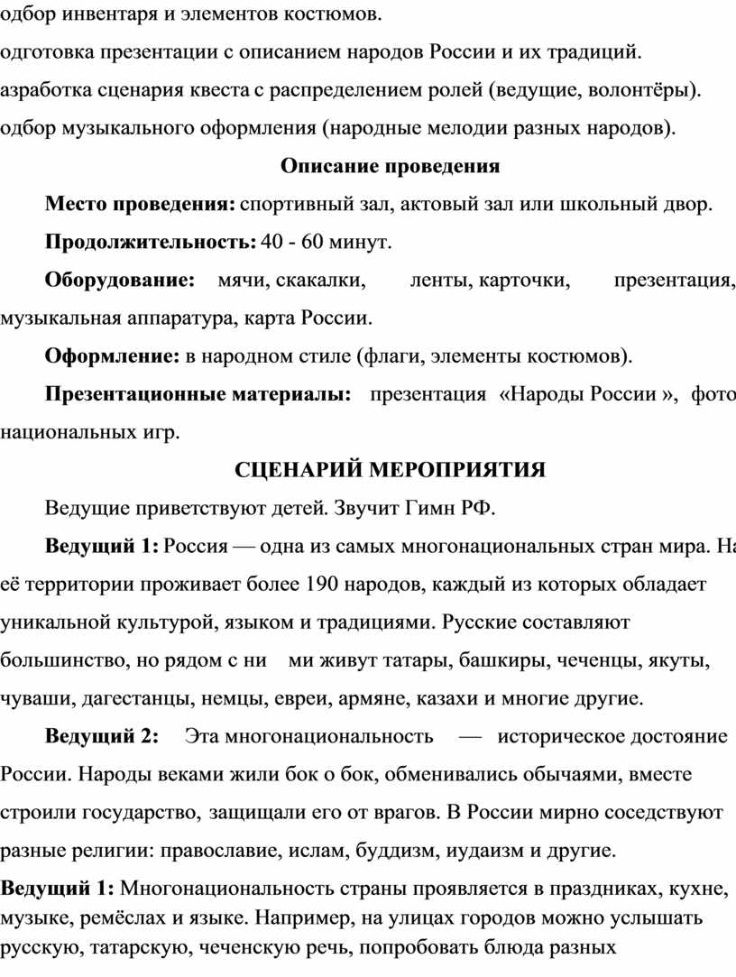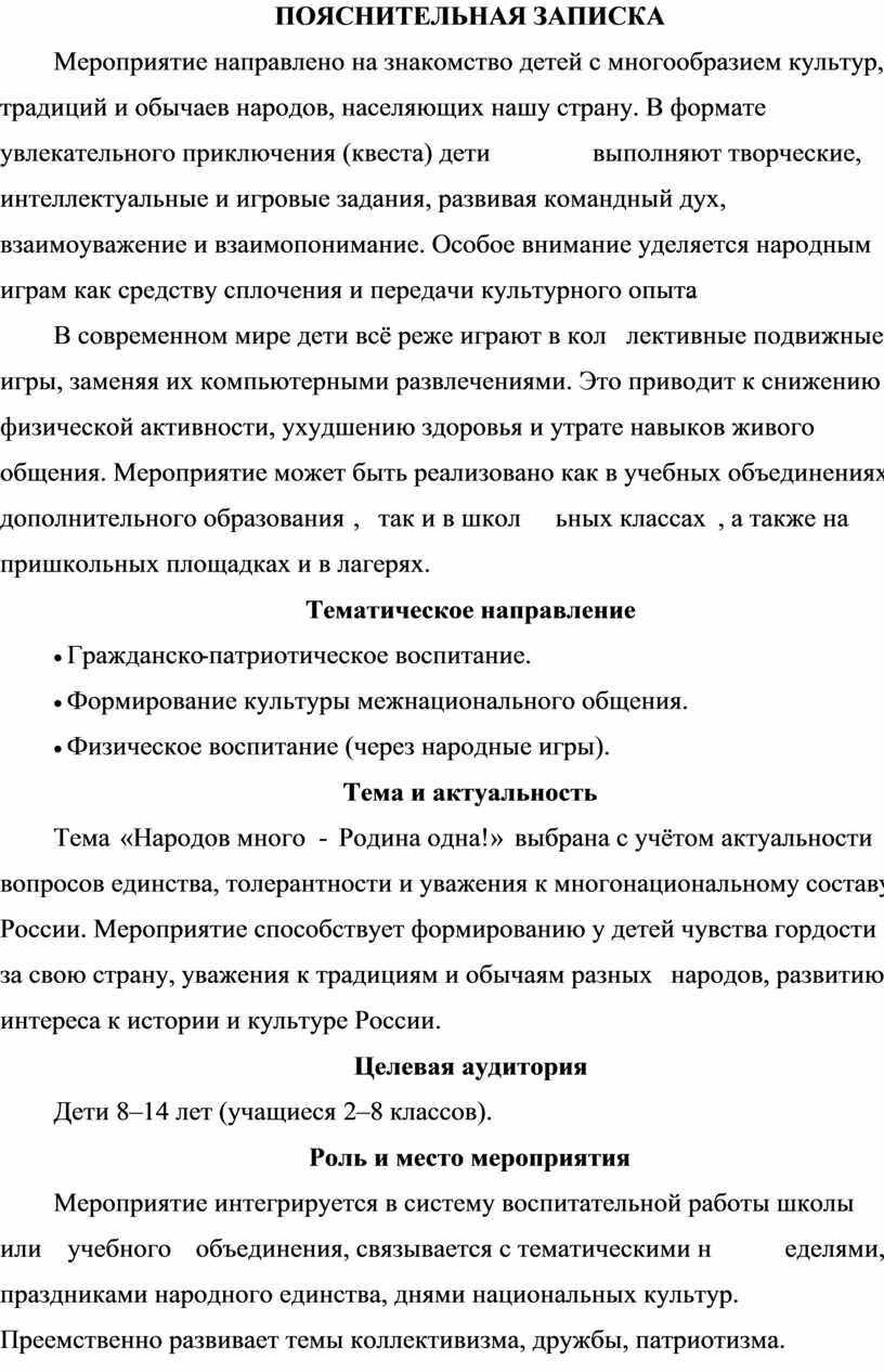 Мероприятие направлено на знакомство детей с многообразием культур, традиций и обычаев народов, населяющих нашу страну. В формате увлекательного приключения (квеста) дети выполняют творческие, интеллектуальные и игровые задания, развивая командный дух, взаимоуважение и взаимопонимание. Особое внимание уделяется народным играм как средству сплочения и передачи культурного опыта.