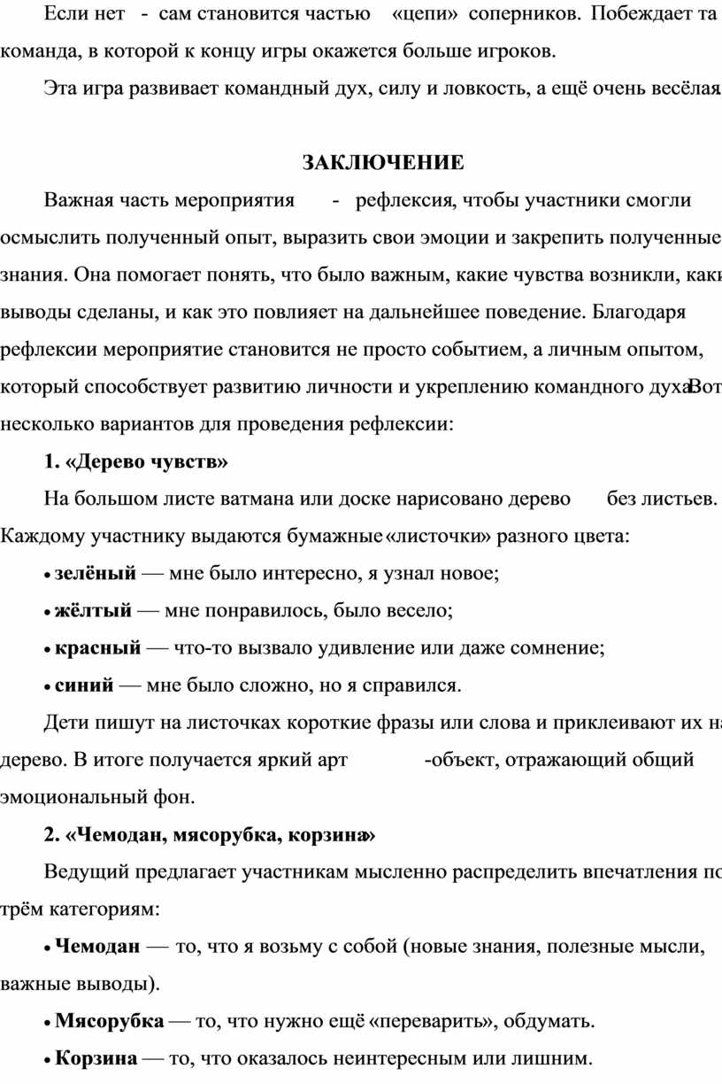 Важная часть мероприятия - рефлексия, чтобы участники смогли осмыслить полученный опыт, выразить свои эмоции и закрепить полученные знания. Она помогает понять, что было важным, какие чувства возникли, какие выводы сделаны, и как это повлияет на дальнейшее поведение. Благодаря рефлексии мероприятие становится не просто событием, а личным опытом, который способствует развитию личности и укреплению командного духа. Вот несколько вариантов для проведения рефлексии: