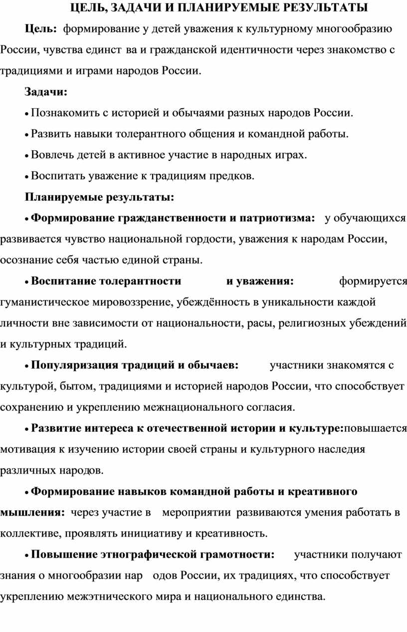 Цель: формирование у детей уважения к культурному многообразию России, чувства единства и гражданской идентичности через знакомство с традициями и играми народов России.