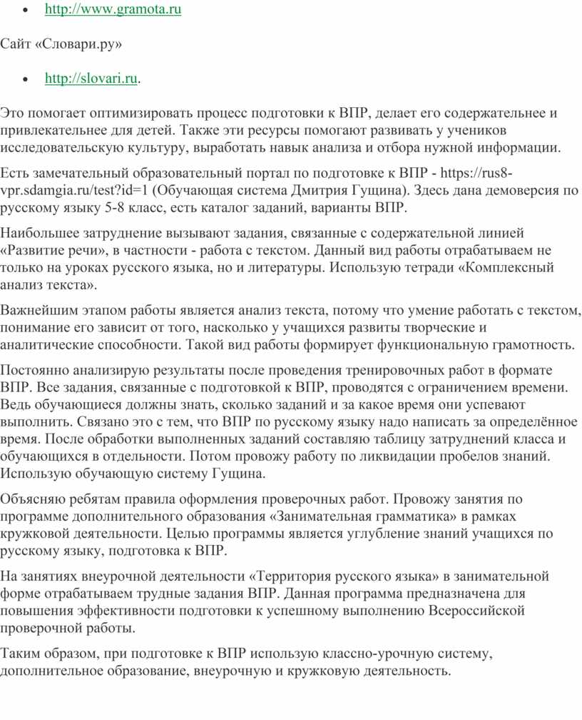 Постоянно анализирую результаты после проведения тренировочных работ в формате ВПР. Все задания, связанные с подготовкой к ВПР, проводятся с ограничением времени. Ведь обучающиеся должны знать, сколько заданий и за какое время они успевают выполнить. Связано это с тем, что ВПР по русскому языку надо написать за определённое время. После обработки выполненных заданий составляю таблицу затруднений класса и обучающихся в отдельности. Потом провожу работу по ликвидации пробелов знаний. Использую обучающую систему Гущина.