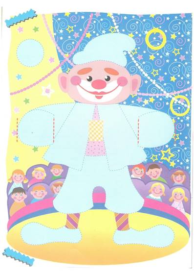 Попросите малыша вырезать картинку и детали к ней с предыдущих страничек. Предложите ребёнку приклеить на картинку костюм клоуна и разгладить тряпочкой каждую деталь. Помогите ребёнку сделать клоуну волосы, разрезав по линиям деталь с шапкой, а затем закрутив полоски с помощью карандаша. Помогите малышу сделать разрезы для рук по пунктирным линиям. Предложите продеть в прорези руки клоуна. Затем помогите малышу сделать гармошку. Для этого нужно согнуть по пунктирным линиям две полоски, как показано на рисунке, нанести клей на клапаны красного цвета, совместить их и склеить. Затем приклеить гармошку к картинке за клапан (место склейки двух частей) в отмеченное на картинке место на животе клоуна. Кончики гармошки нужно приклеить к рукам клоуна за клапаны синего цвета. Если малыш склеит всё аккуратно, гармошка будет растягиваться и сжиматься.