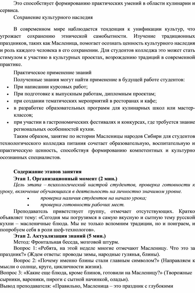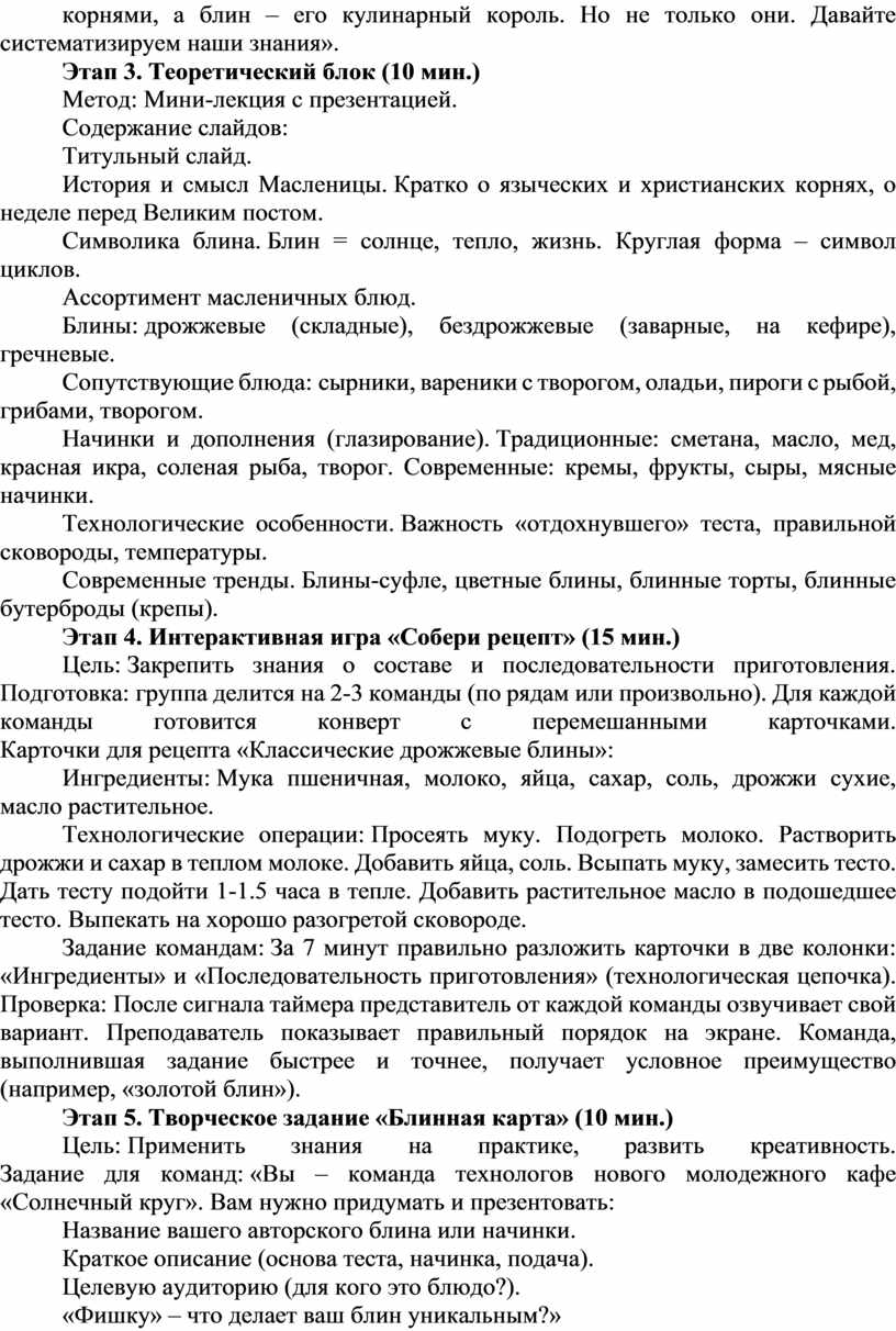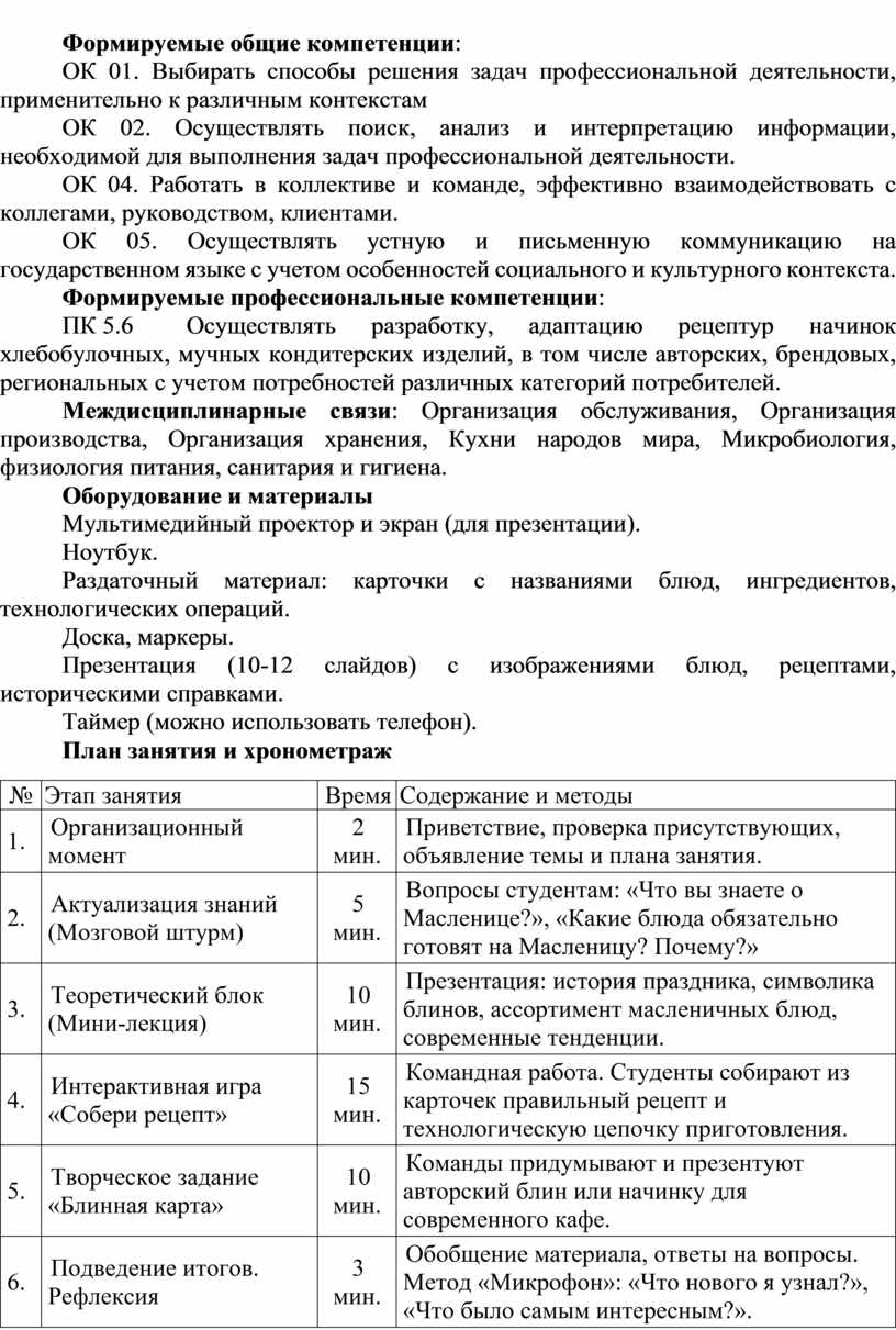 Преподаватель приветствует группу, отмечает отсутствующих. Кратко объявляет тему: «Сегодня мы погрузимся в самую вкусную и сытную тему русской кухни – масленичные блюда. Мы не только вспомним традиции, но и поиграем, и попробуем себя в роли шеф-технологов».