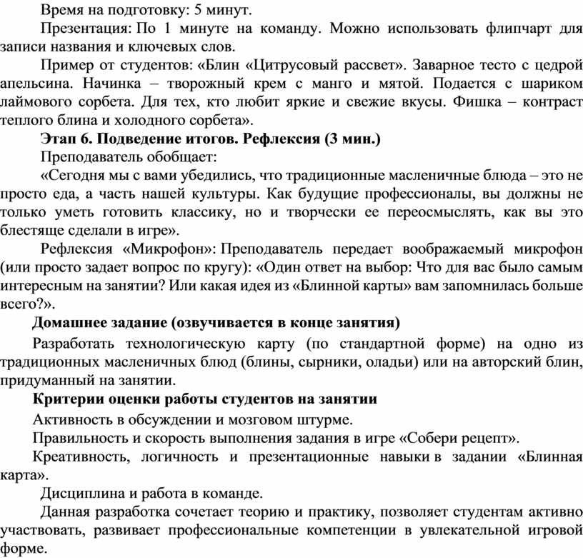 Рефлексия «Микрофон»: Преподаватель передает воображаемый микрофон (или просто задает вопрос по кругу): «Один ответ на выбор: Что для вас было самым интересным на занятии? Или какая идея из «Блинной карты» вам запомнилась больше всего?».