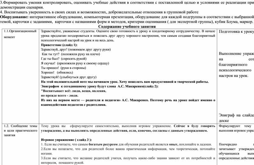 Здравствуйте, уважаемые студенты. Оцените свою готовность к уроку и плодотворному сотрудничеству. В начале урока предлагаю поздороваться и пожелать друг другу хорошего настроения, тем самым создавая благоприятный психологический настрой на урок и на весь день. Приветствие (слайд 1): 1. Здравствуй, друг! (пожимаем друг другу руки) 2. Как ты тут? (положили руку на плечо) 3. Где ты был? (спросить рукой) 4. Я скучал! (приложили руку к своему сердцу) 5. Ты пришел! (руки в стороны) 6. Хорошо! (обнялись) 7. Здравствуй! (улыбнуться друг другу) На этой положительной ноте мы начинаем урок. Хочу пожелать вам продуктивной и творческой работы. Эпиграфом к сегодняшнему уроку будут слова А.С. Макаренко(слайд 2): "Воспитывает всё: люди, вещи, явления, но прежде всего - люди. Из них на первом месте — родители и педагоги» А.С. Макаренко. Поэтому речь на уроке пойдет именно о взаимодействии педагогов с родителями. |