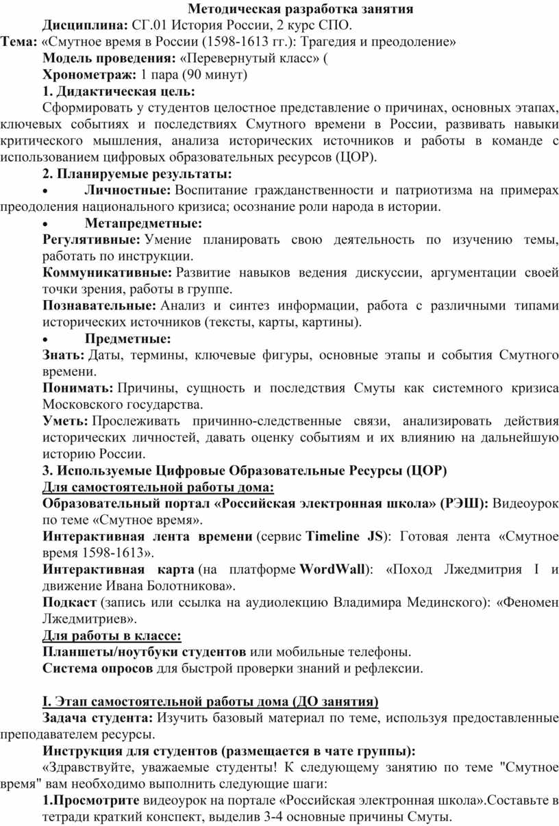 Сформировать у студентов целостное представление о причинах, основных этапах, ключевых событиях и последствиях Смутного времени в России, развивать навыки критического мышления, анализа исторических источников и работы в команде с использованием цифровых образовательных ресурсов (ЦОР).