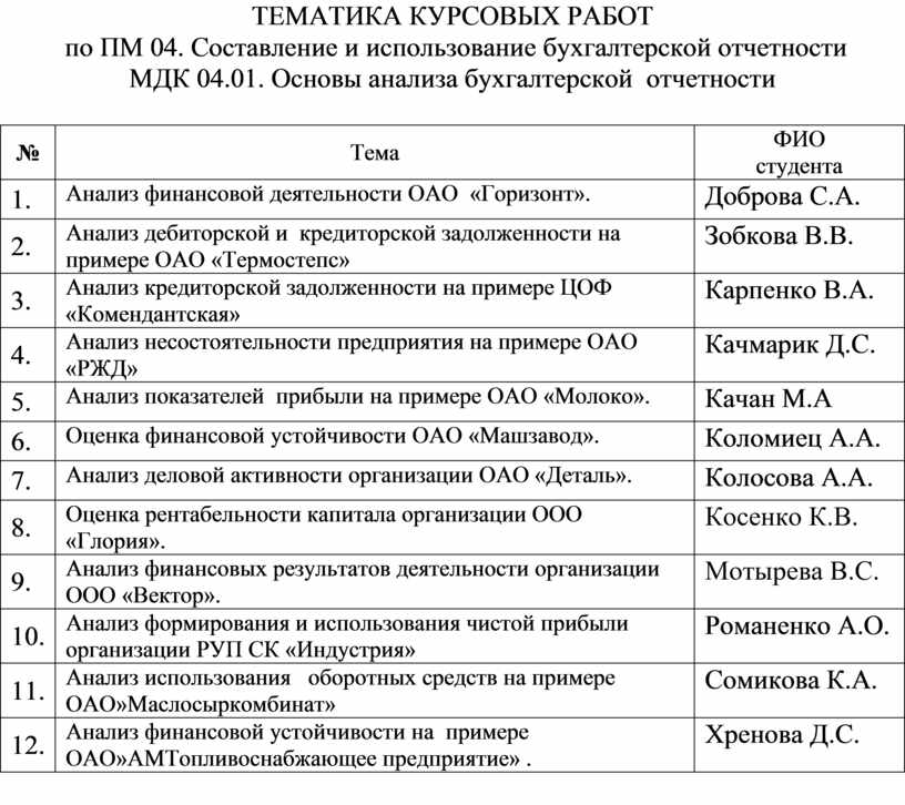 ТЕМА КУРСОВЫХ РАБОТ |