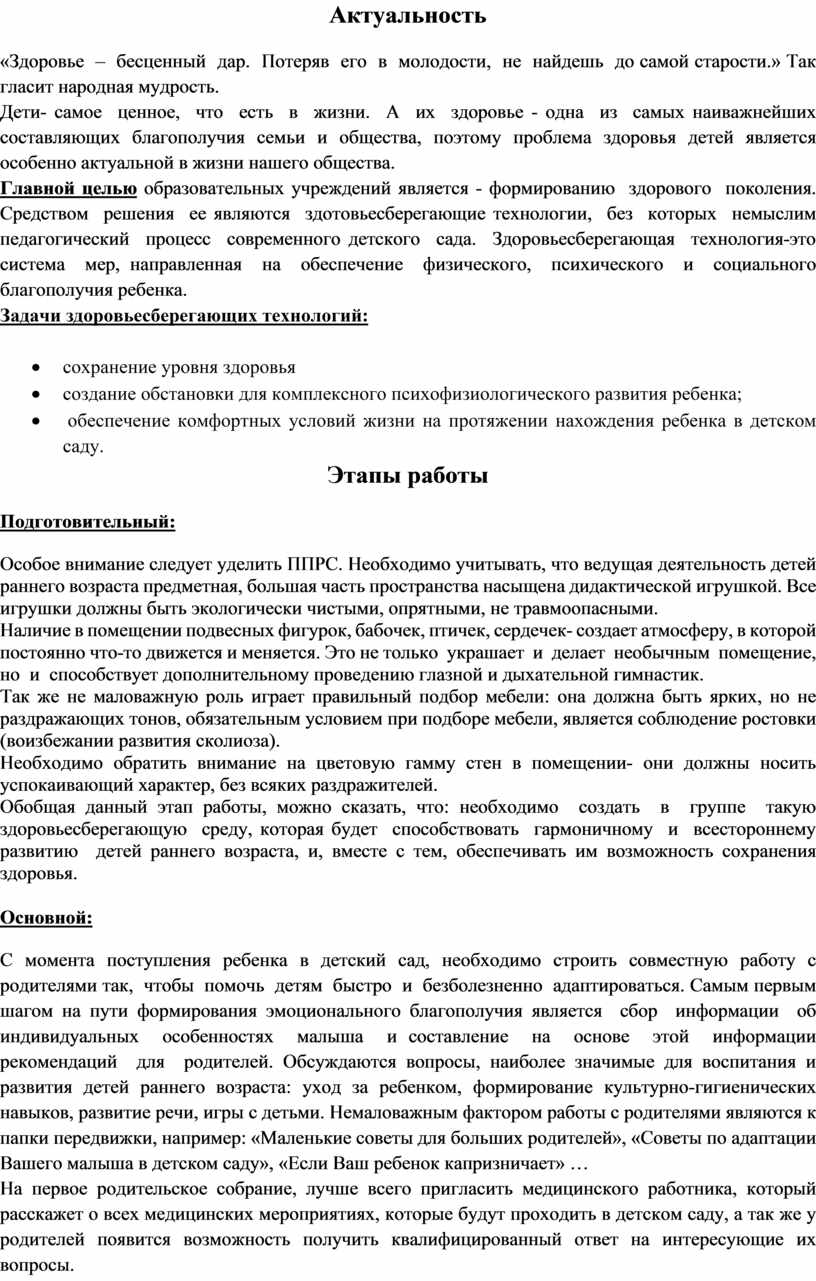 Главной целью образовательных учреждений является - формированию здорового поколения. Средством решения ее являются здотовьесберегающие технологии, без которых немыслим педагогический процесс современного детского сада. Здоровьесберегающая технология-это система мер, направленная на обеспечение физического, психического и социального благополучия ребенка.