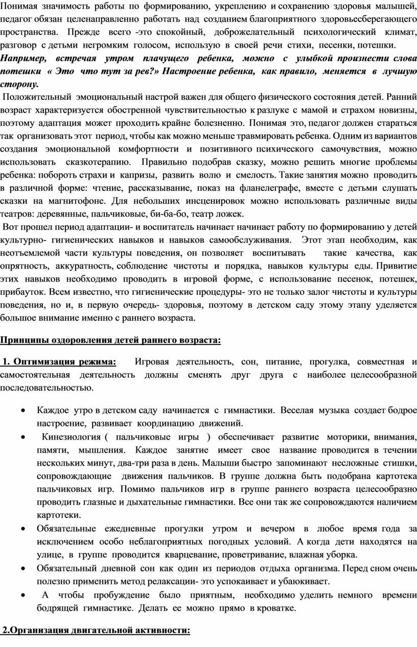 Понимая значимость работы по формированию, укреплению и сохранению здоровья малышей, педагог обязан целенаправленно работать над созданием благоприятного здоровьесберегающего пространства. Прежде всего -это спокойный, доброжелательный психологический климат, разговор с детьми негромким голосом, использую в своей речи стихи, песенки, потешки.