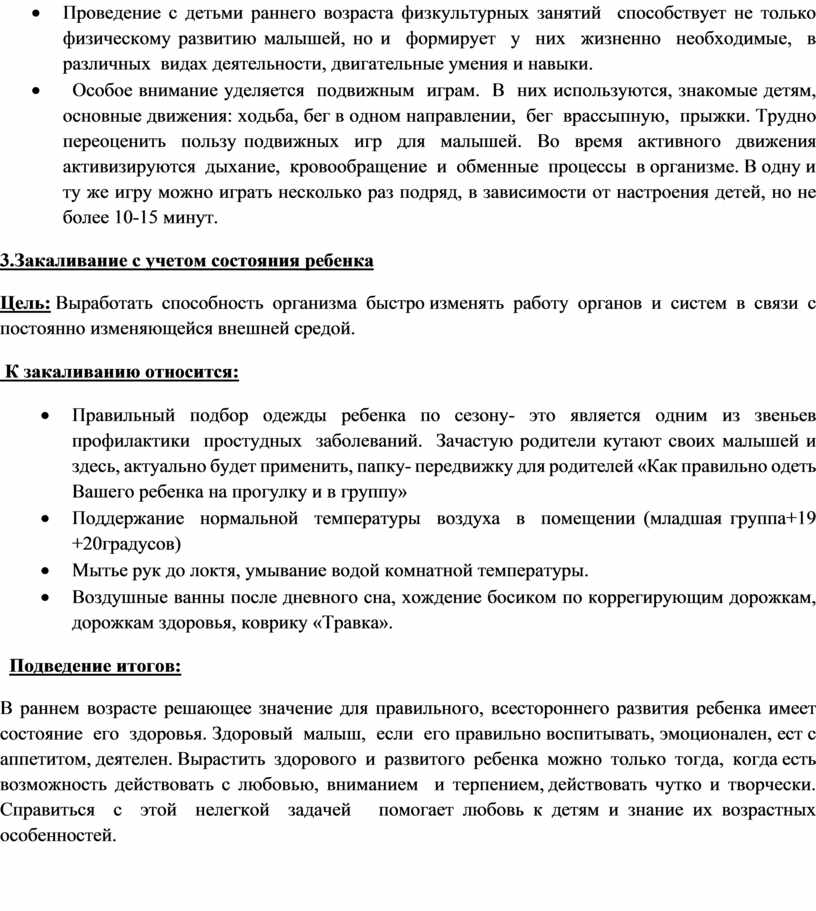 В раннем возрасте решающее значение для правильного, всестороннего развития ребенка имеет состояние его здоровья. Здоровый малыш, если его правильно воспитывать, эмоционален, ест с аппетитом, деятелен. Вырастить здорового и развитого ребенка можно только тогда, когда есть возможность действовать с любовью, вниманием и терпением, действовать чутко и творчески. Справиться с этой нелегкой задачей помогает любовь к детям и знание их возрастных особенностей.