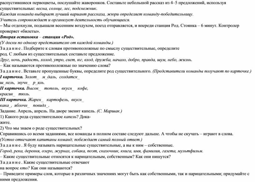 остановимся в этом лесу (Звучит музыка П. И. Чайковского из цикла «Времена года».) Задание. Посмотрите на эти проталинки, распустившиеся первоцветы, послушайте жаворонков. Составьте небольшой рассказ из 4–5 предложений, используя существительные: весна, солнце, лес, подснежник. Каждая команда выбирает лучший вариант рассказа, жюри определяет команду-победительницу. Учитель сопровождает и организует деятельность обучающихся. – Мы отдохнули, подышали весенним воздухом, поезд отправляется, и впереди станция Род. Стоянка – 6 минут. Контролер проверяет «билеты». Вторая остановка – станция «Род». (У доски по одному представителю от каждой команды.) Задание. Подберите к словам