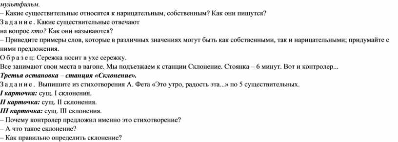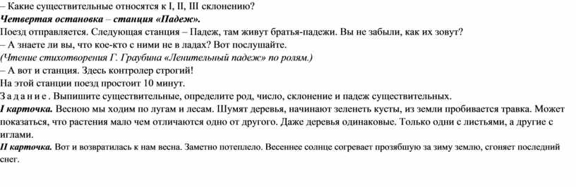 существительные отвечают – Приведите примеры слов, которые в различных значениях могут быть как собственными, так и нарицательными; придумайте с ними предложения. Образец: Сережка носит в ухе сережку. Все занимают свои места в вагоне. Мы подъезжаем к станции Склонение. Стоянка – 6 минут. Вот и контролер... Третья остановка – станция «Склонение». Задание. Выпишите из стихотворения А. Фета «Это утро, радость эта...» по 5 существительных. I карточка: сущ. I склонения. II карточка: сущ. II склонения. III карточка: сущ. III склонения. – Почему контролер предложил именно это стихотворение? – А что такое склонение? – Как правильно определить склонение? – Какие существительные относятся к I, II, III склонению? Четвертая остановка – станция «Падеж». Поезд отправляется. Следующая станция – Падеж, там живут братья-падежи. Вы не забыли, как их зовут? – А знаете ли вы, что кое-кто с ними не в ладах? Вот послушайте. (Чтение стихотворения Г. Граубина «Ленительный падеж» по ролям.) – А вот и станция. Здесь