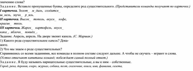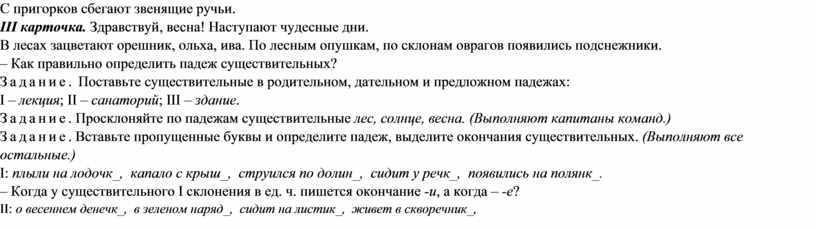 землю, сгоняет последний снег. III карточка. Здравствуй, весна! Наступают чудесные дни. В лесах зацветают орешник, ольха, ива. По лесным опушкам, по склонам оврагов появились подснежники. – Как правильно определить падеж существительных? Задание. Поставьте существительные в родительном, дательном и предложном падежах: I – лекция; II – санаторий; III – здание. Задание. Просклоняйте по падежам существительные лес, солнце, весна. (Выполняют капитаны команд.) Задание. Вставьте пропущенные буквы и определите падеж, выделите окончания существительных. (Выполняют все остальные.) I: плыли на лодочк_, капало с крыш_, струился по долин_, сидит у речк_, появились на полянк_. – Когда у существительного I склонения в ед. ч. пишется окончание -и, а когда – -е? II: о весеннем денечк_, в зеленом наряд_, сидит на листик_, живет в скворечник_, говорил о дождик_. – Когда у существительных II склонения в ед. числе пишется -е, а когда – -и? III: просил о помощ_, искал