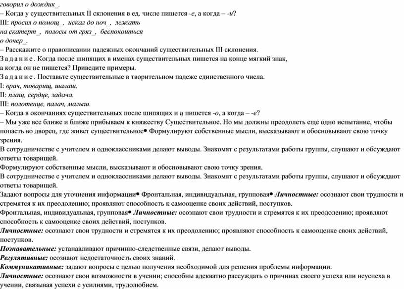 Предметные (объем освоения и уровень владения компетенциями): знать вопросы, на которые отвечает имя существительное, морфологические признаки существительного (род, число, падеж, типы склонения), правила об употреблении и неупотреблении на письме ь после шипящих на конце слова у существительных, е и и в безударных падежных окончаниях существительных в единственном числе; уметь ставить вопросы к существительным, определять число, род, падеж, тип склонения существительного, правильно употреблять ь после шипящих на конце слова у существительных, выбирать написание е и и в безударных падежных окончаниях существительных в единственном числе, графически обозначать условия выбора правильных написаний, разбирать имена существительные по образцу. Метапредметные (компоненты культурно-компетентностного опыта/приобретенная компетентность): способность извлекать информацию из различных источников, включая средства массовой информации, компакт-диски учебного назначения, ресурсы Интернета; свободно пользоваться словарями различных типов, справочной литературой, в том числе и на электронных носителях. Личностные: осознание эстетической ценности русского языка; уважительное отношение к родному языку, гордость за него; потребность сохранить чистоту русского языка как явления национальной культуры; стремление к речевому самосовершенствованию |